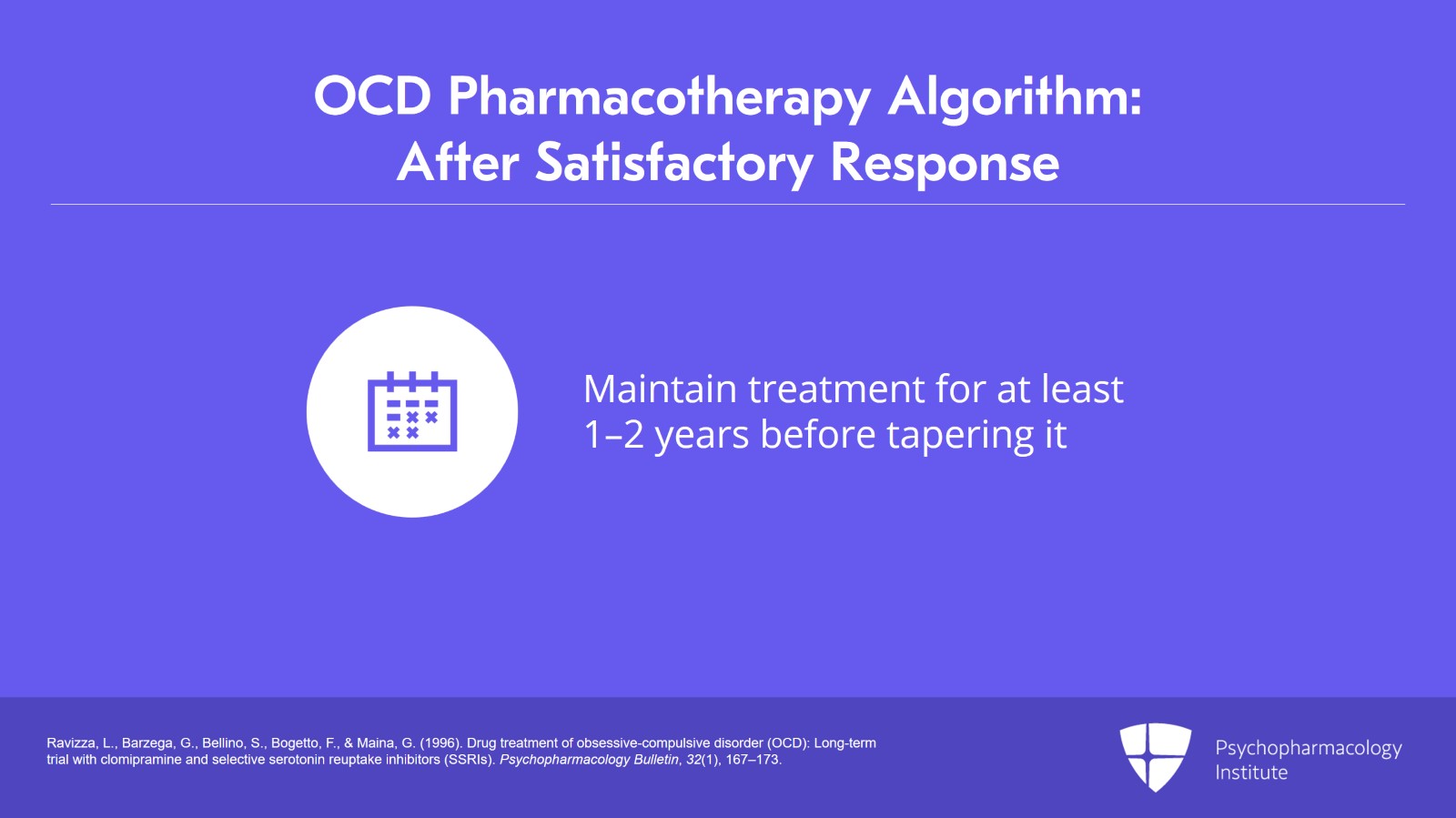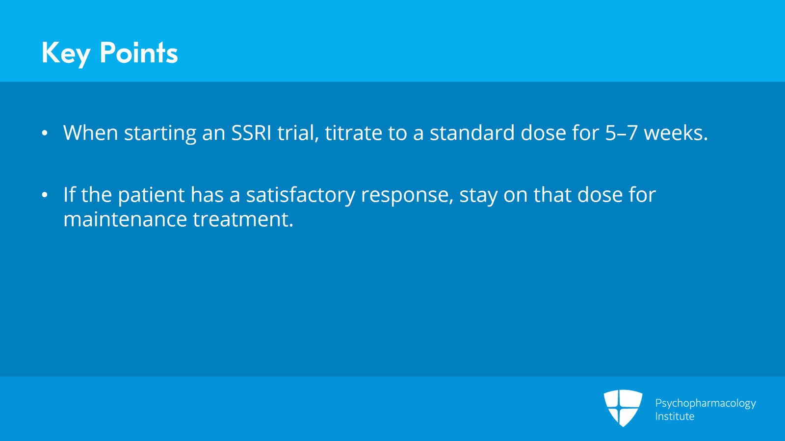 So the key points of this video are that we are looking at the parameters of an adequate trial of an SSRI for OCD and we're recommending that you would first titrate to a standard dose for five to seven weeks. And if the patient is on course for a satisfactory response, you can stay on that dose for maintenance.