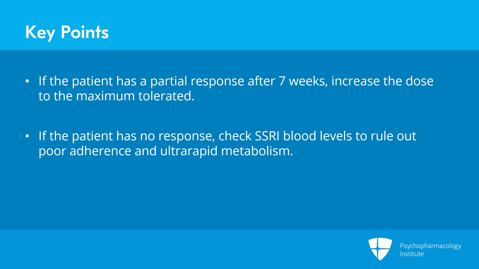 But if it doesn't seem like it's going to be a satisfactory response even with a little more time on the drug, then at this point like seven weeks they've had a partial response you could increase it to the PDR max. If they had no response at all, we're recommending a blood level and a zero level brings up the possibility of poor adherence and zero or low levels also raise the possibility of ultrarapid metabolizer status.