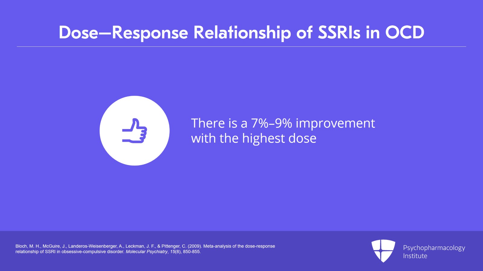 - Bloch, M. H., McGuire, J., Landeros-Weisenberger, A., Leckman, J. F., & Pittenger, C. (2009). Meta-analysis of the dose-response relationship of SSRI in obsessive-compulsive disorder. Molecular Psychiatry, 15(8), 850-855.