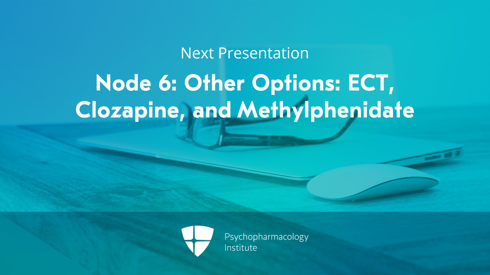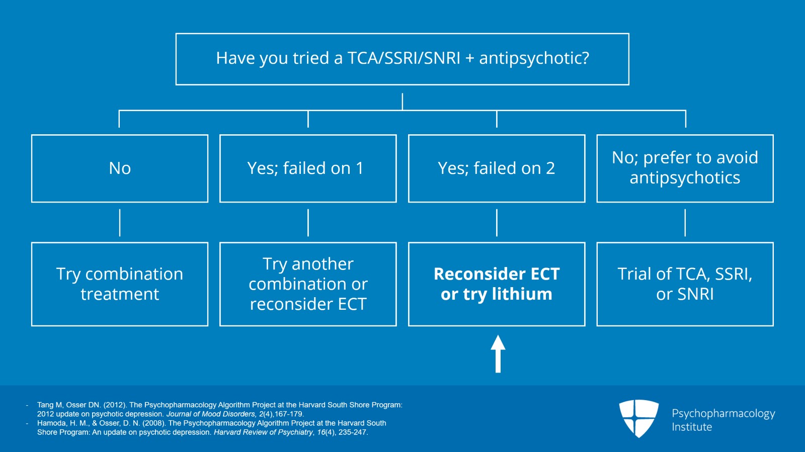 The previous videos have taken you through the evidence on the various possible combinations, which antidepressant to choose, which antipsychotic to choose and which to choose second depending on what you chose first. But if you've had 2 trials and you've had an unsatisfactory response and you're not doing ECT, which we strongly suggest, and you want to keep with pharmacotherapy… We're at node 5 — have you tried adding lithium?
