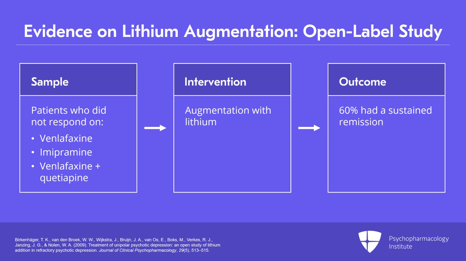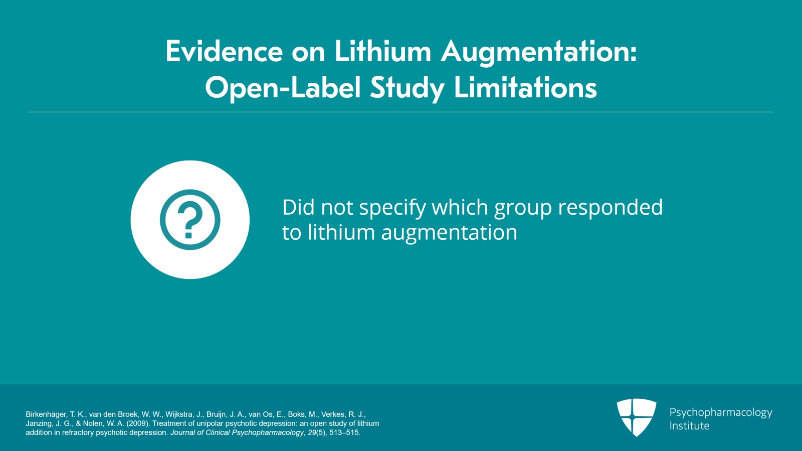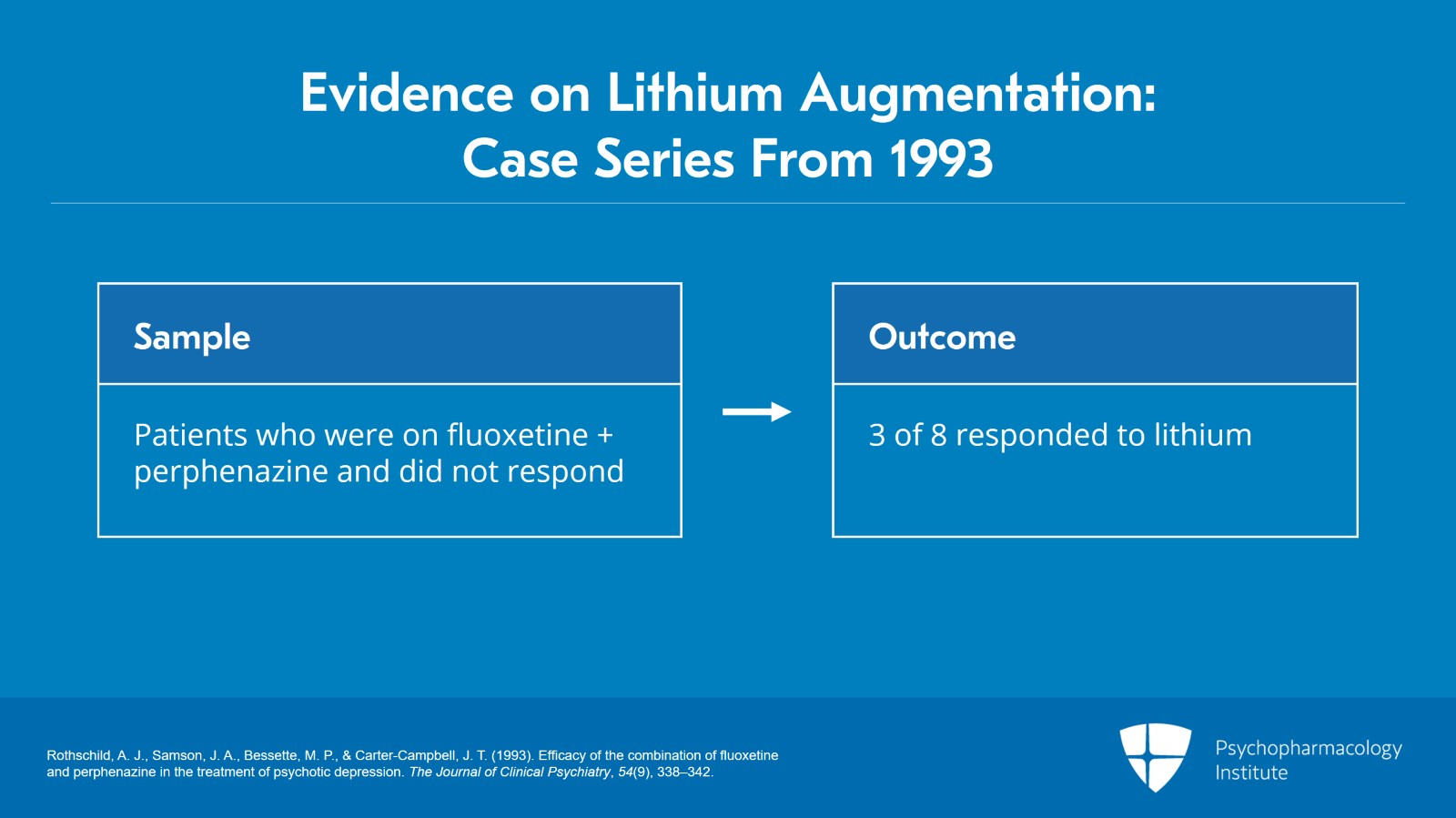 So what evidence do we have on that? Well, not a whole lot. There was a case series of 20 patients that was published in 1986. These were people who were on a tricyclic plus a first-generation antipsychotic and had not done well and they were augmented with lithium. Forty percent had at least a partial, ranging from a partial to a marked response. So, we're not talking about a robust additional response, but a significant number did proceed to further improvement with addition of lithium.
