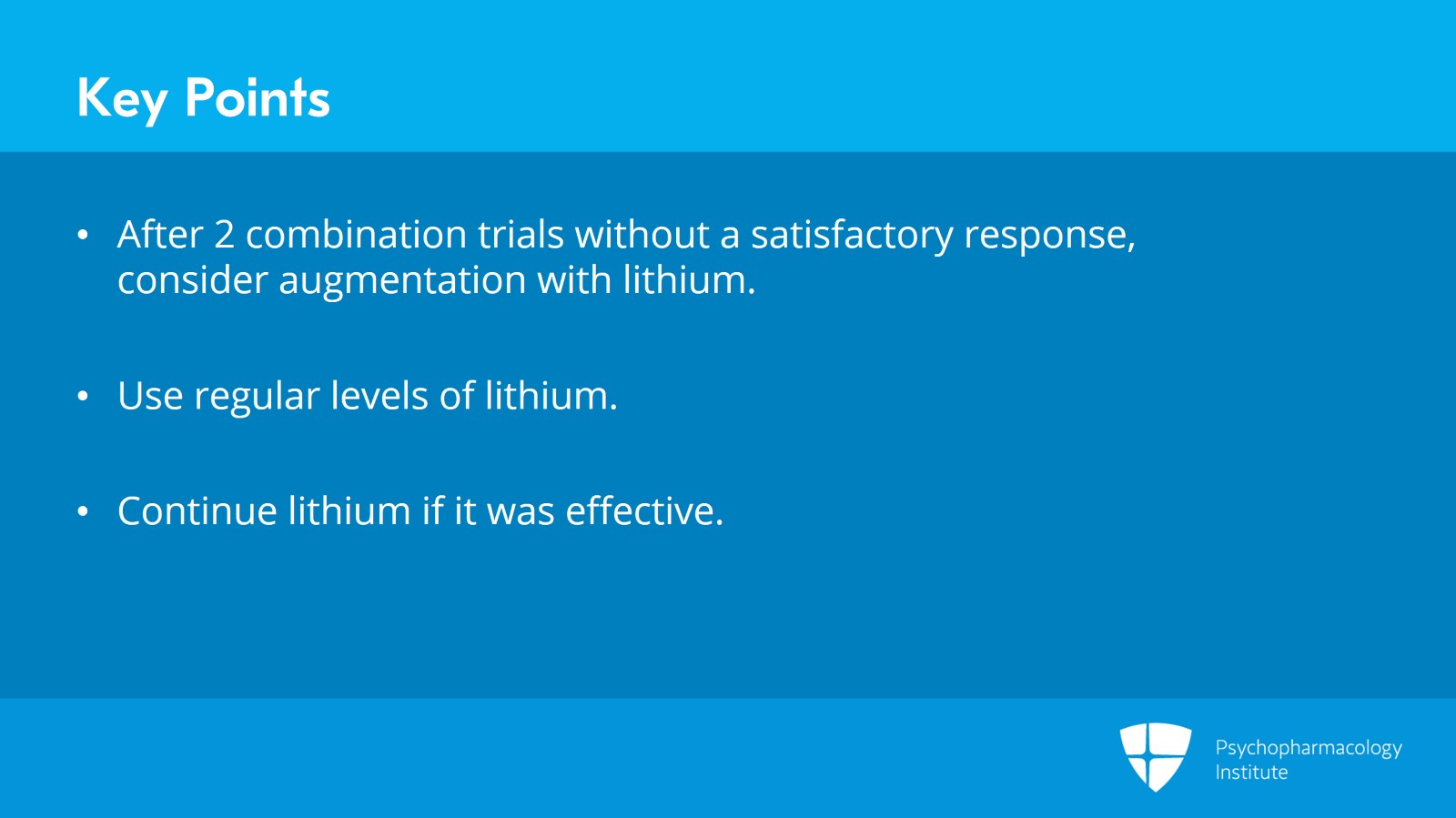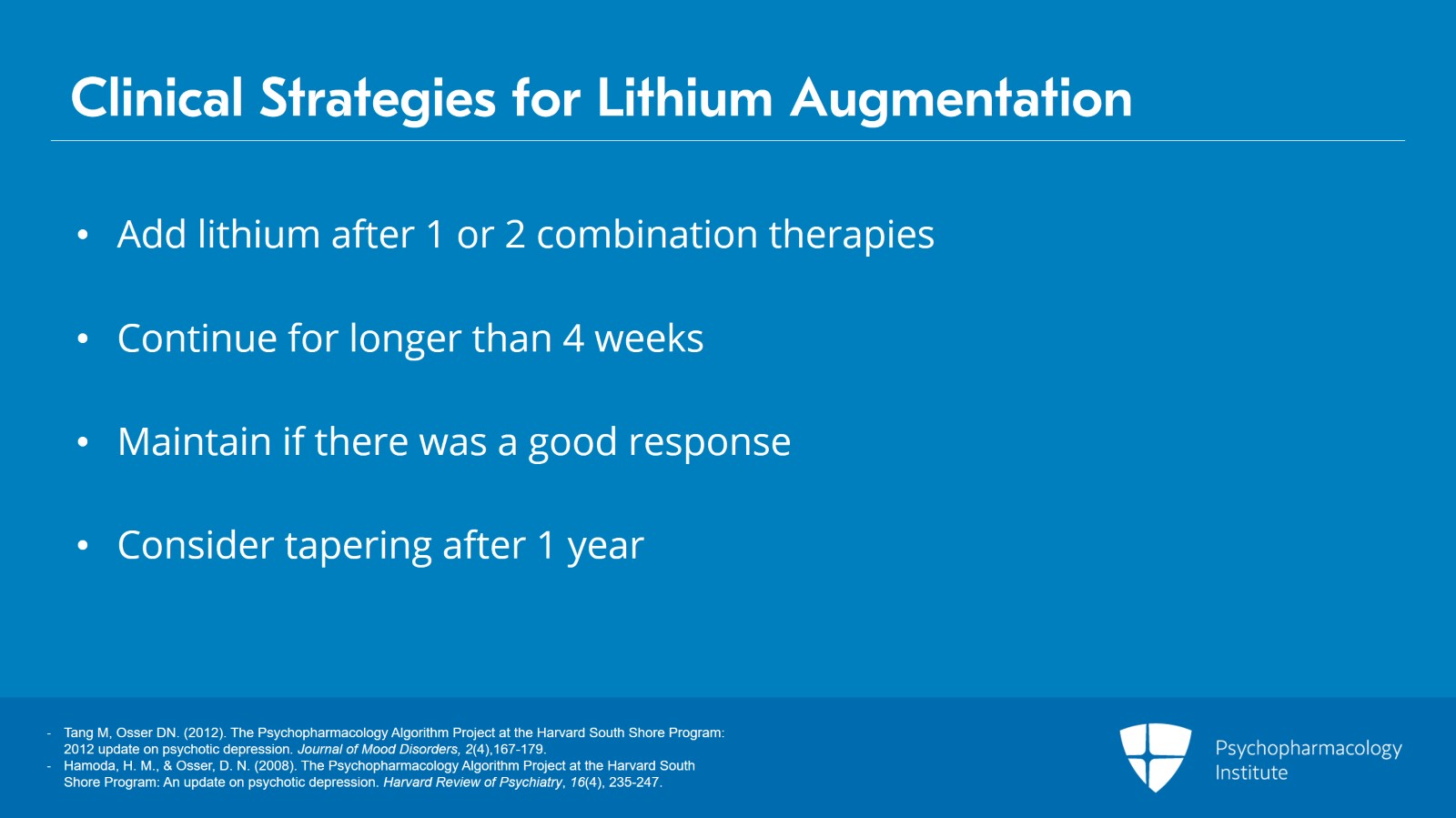 So in short, from this really minimal evidence, we think it's reasonable to add lithium after at least 1 or probably 2 combination therapies of the ones that we've suggested and if ECT is not a serious consideration and you might as well use typical blood levels of lithium. And you might as well continue for longer than 4 weeks and maintain them on it if you do get a good response because we don't have much else in terms of evidence on augmentation strategies. Maybe after a year, you could consider tapering it and see what happens. But if you are fortunate enough to get this long-sought improvement, you might as well keep everything going that you were initiating.