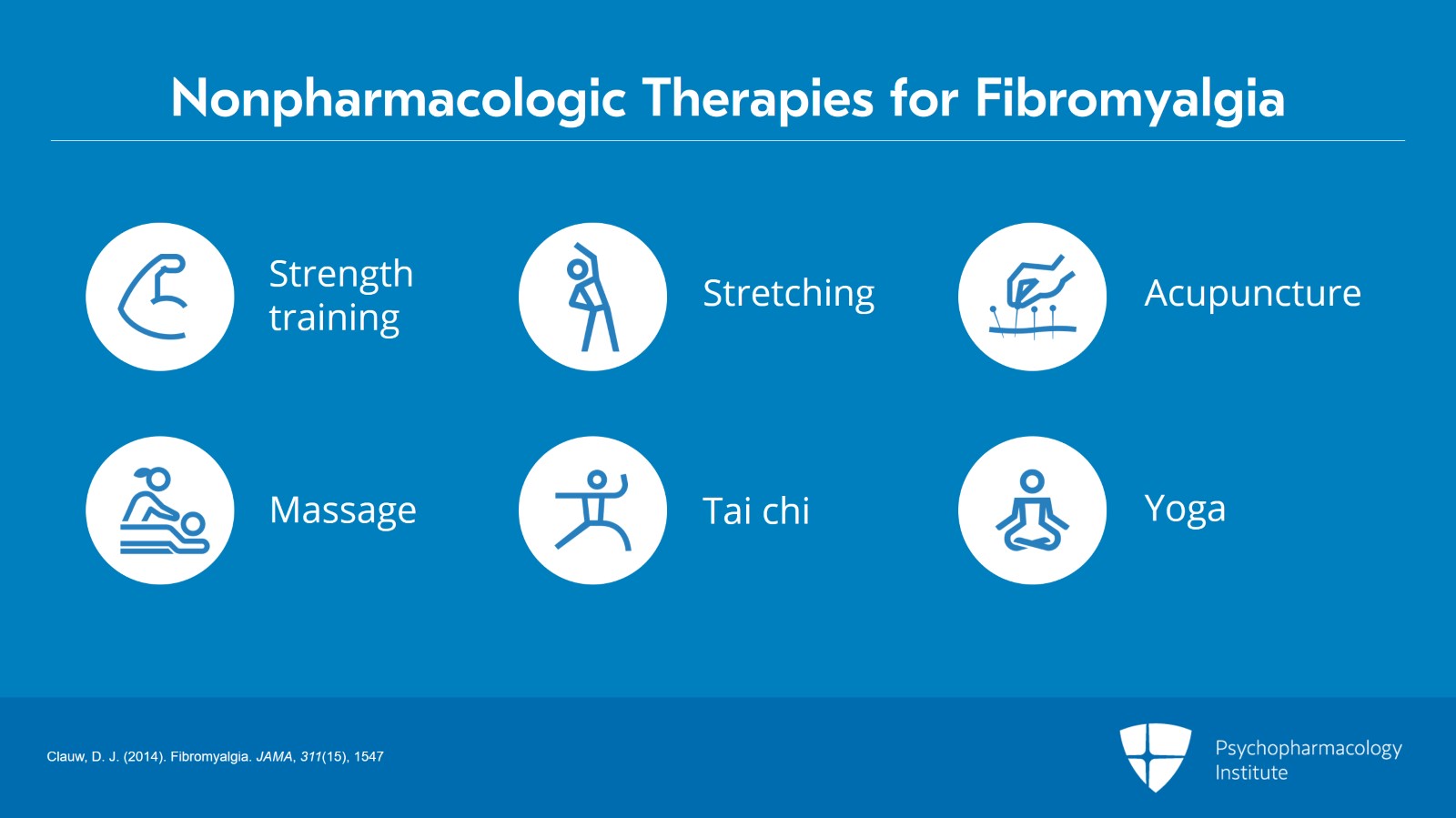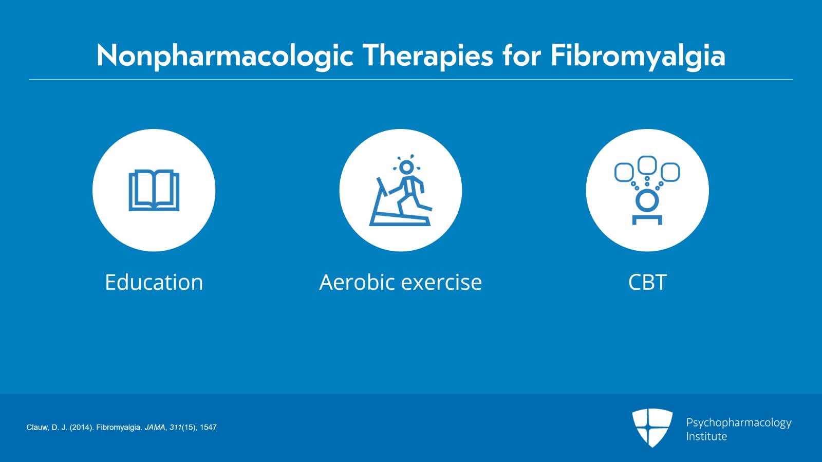 This slide shows the nonpharmacologic therapies for fibromyalgia.