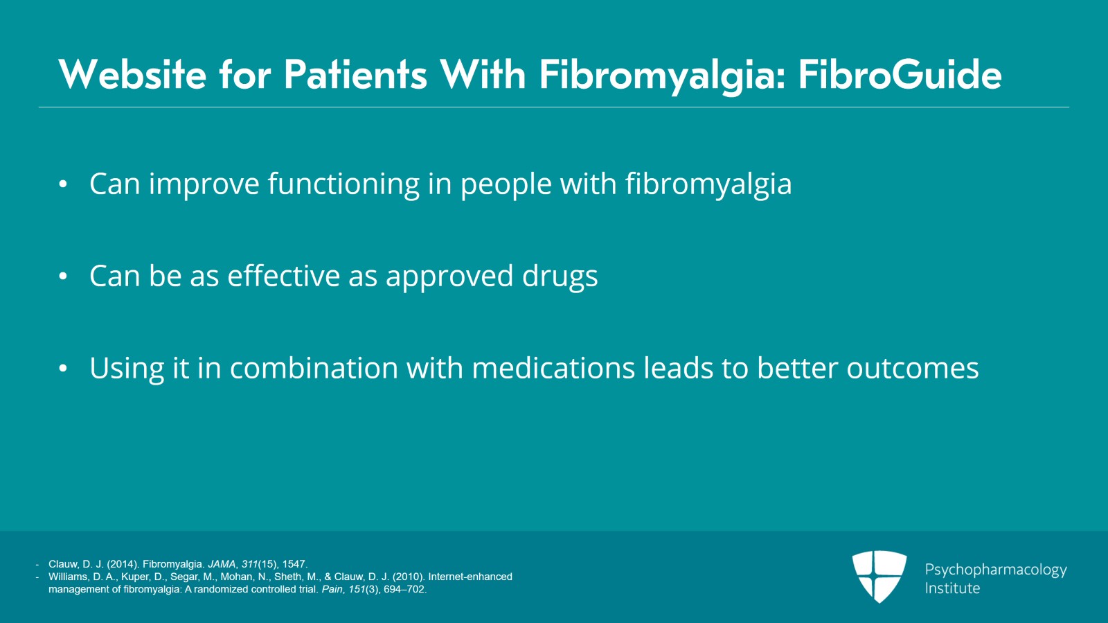- Williams, D. A., Kuper, D., Segar, M., Mohan, N., Sheth, M., & Clauw, D. J. (2010). Internet-enhanced management of fibromyalgia: A randomized controlled trial. Pain, 151(3), 694–702.