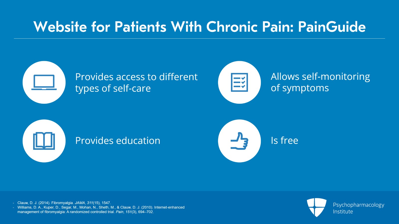 It’s PainGuide, www.painguide.com. And this is being tested in a number of ongoing NIH-funded studies. It’s much better than the original version of FibroGuide. It gives people direct access to a number of different types of self-care. It talks about diet and nutrition, reframing, relaxation.