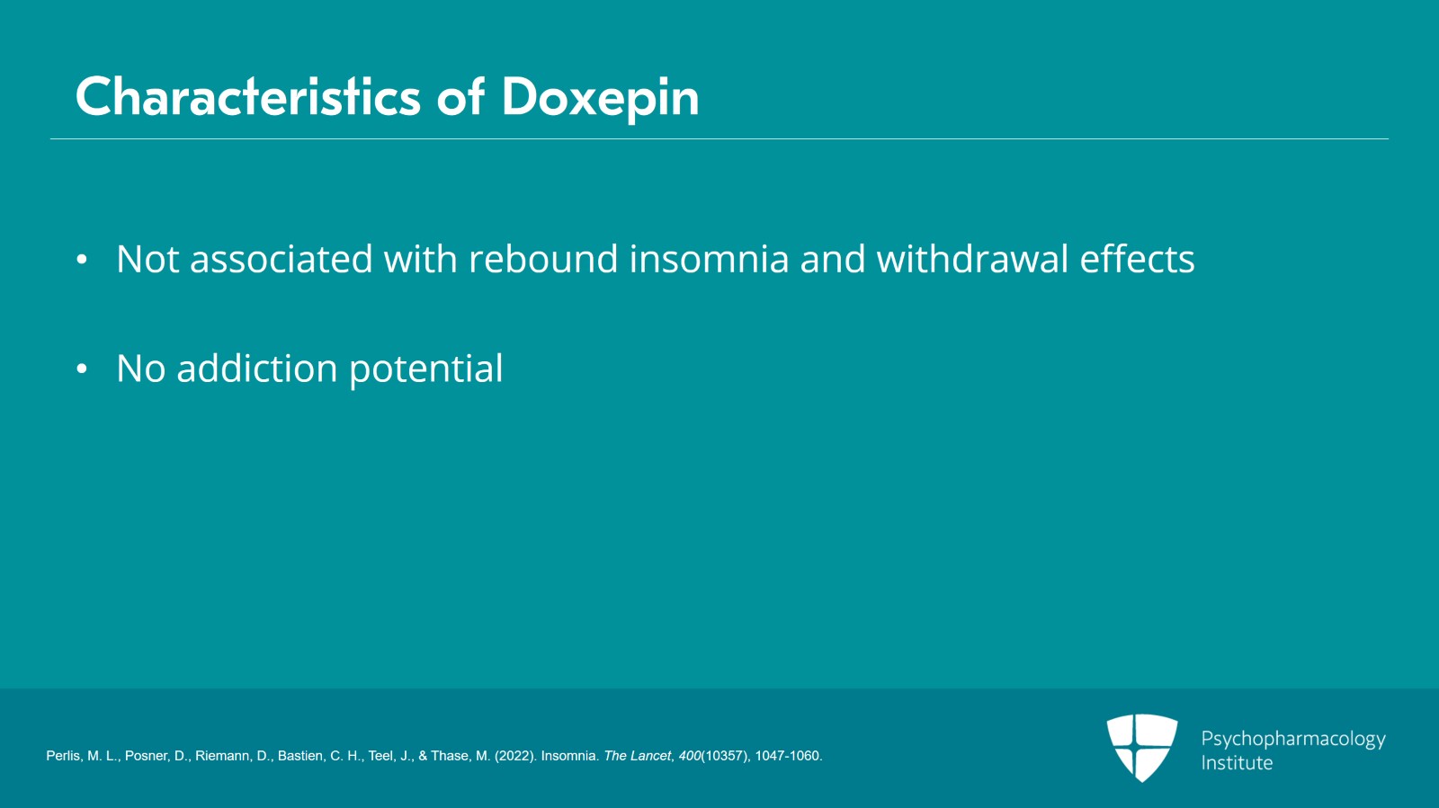 Doxepin is not associated with rebound insomnia and withdrawal effects upon discontinuation and it has not been shown to have any addiction potential.