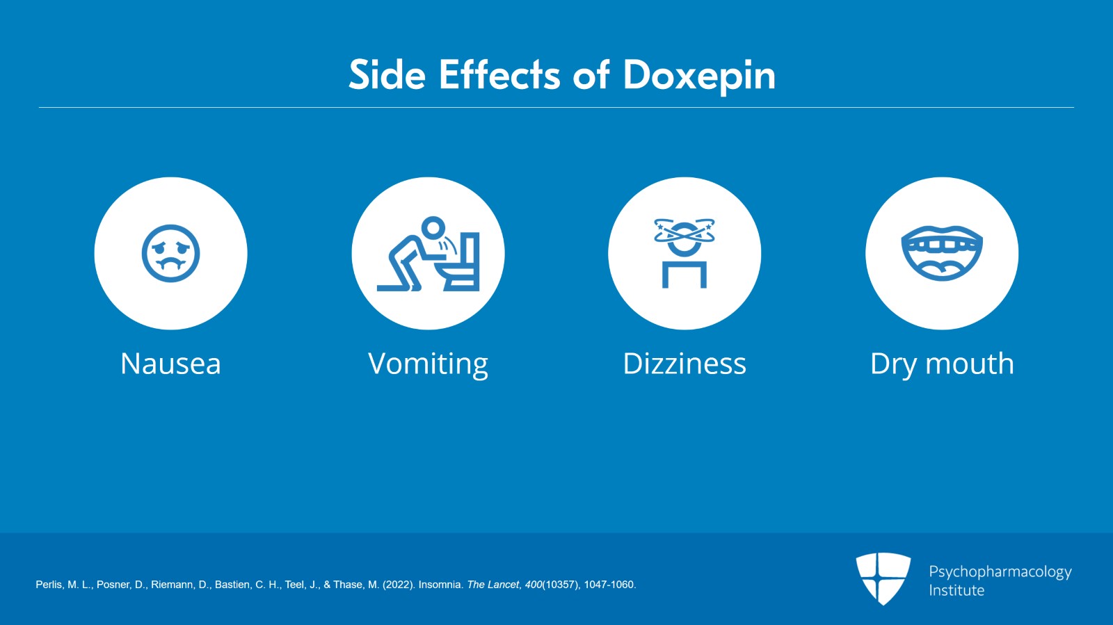 Side effects of doxepin use include nausea, vomiting, dizziness and dry mouth.