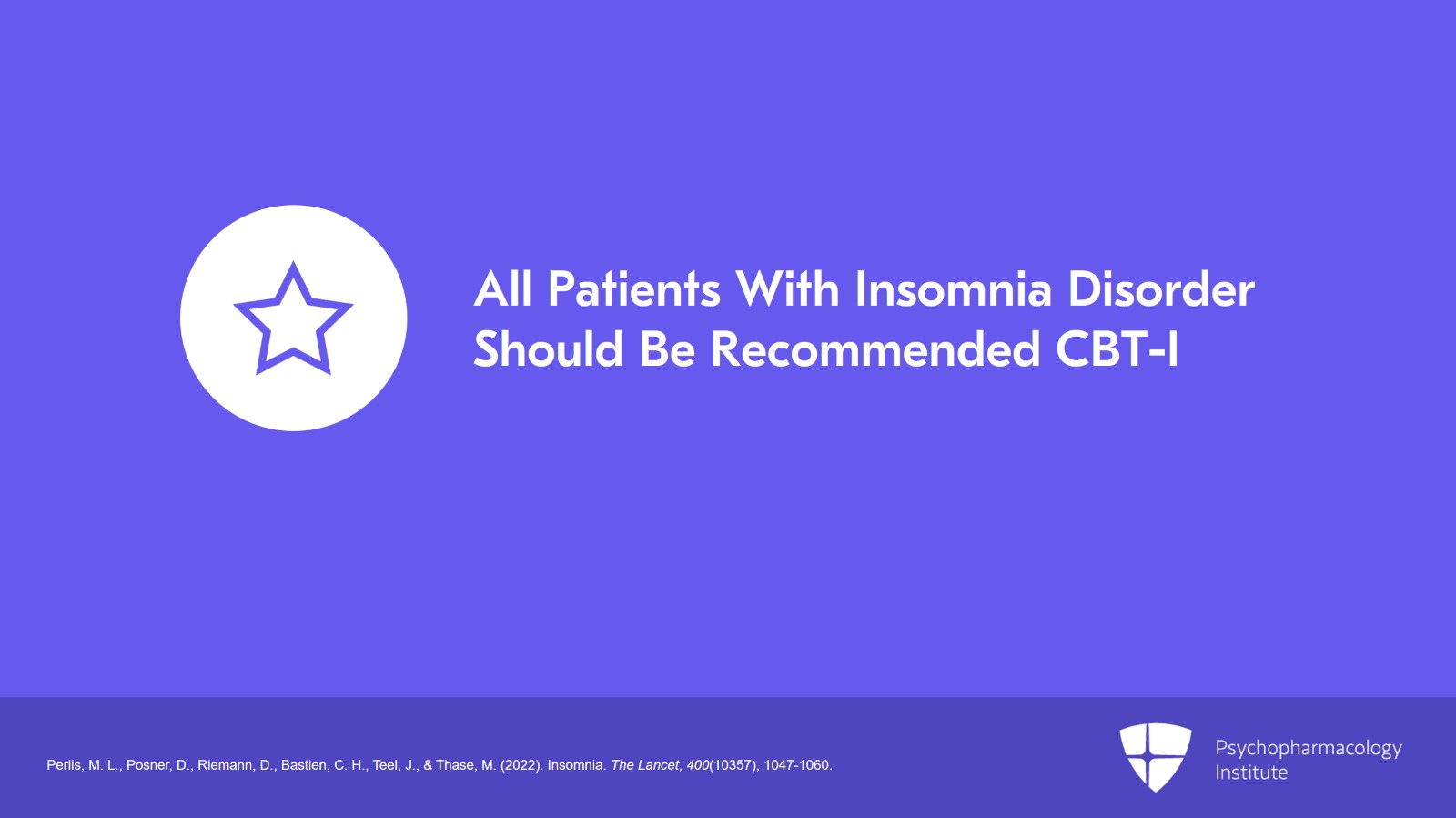 All patients with insomnia disorder should be recommended cognitive behavioral therapy for insomnia or CBT-I as a primary intervention as it carries significantly favorable benefit-risk ratio.