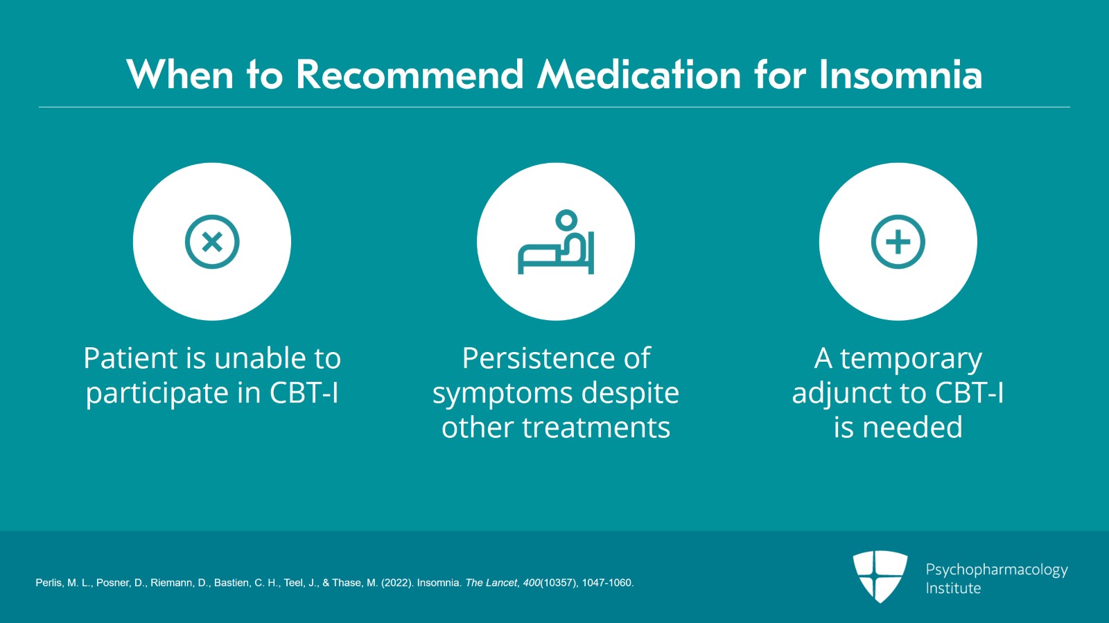 Medications should be recommended for patients who are unable to participate in CBT-I, who still have symptoms despite participation in such treatments or in select cases as a temporary adjunct to CBT-I.