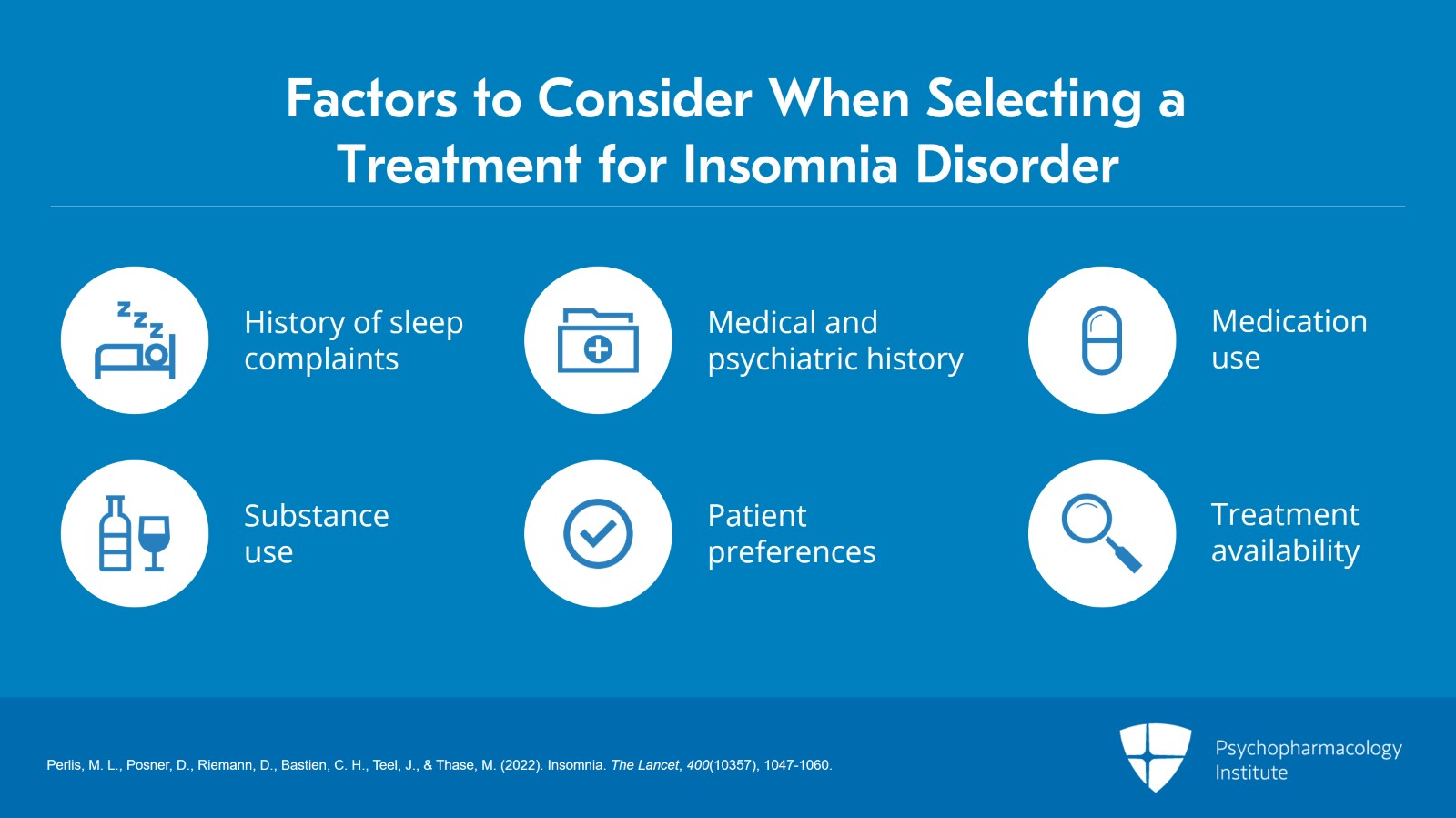 Clinicians should perform a comprehensive initial evaluation including a detailed history of sleep complaints, medical and psychiatric history, medication use and substance use. These factors together with patient preferences and treatment availability should be used to select specific treatments for specific patients.