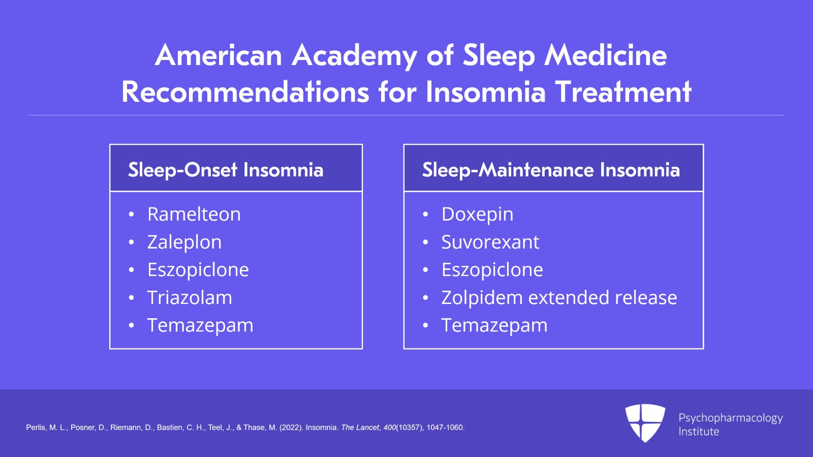 American Academy of Sleep Medicine recommends the use of ramelteon, zaleplon, eszopiclone, triazolam and temazepam for sleep-onset insomnia. For treatment of sleep maintenance insomnia, American Academy of Sleep Medicine recommends use of doxepin, suvorexant, eszopiclone, zolpidem extended release and temazepam.