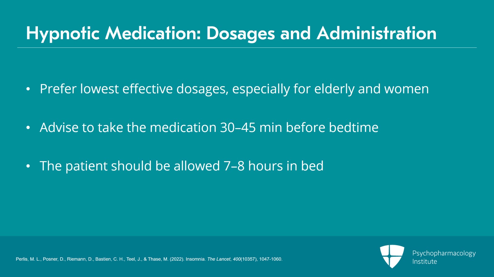 It is preferable to use lowest effective dosages in adults and even lower dosages in elderly and in women for certain compounds. The FDA mandated a lower starting dose for zolpidem, zolpidem ER and eszopiclone in women as compared to men. The patients should be advised to take the medication 30 to 45 minutes before the desired bedtime and the patient should be allowed seven to eight hours in bed or at least four hours when using a zolpidem sublingual formulation or zaleplon for middle of the night insomnia.
