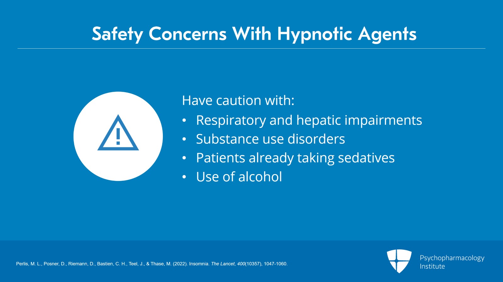 Caution should be exercised in patients with respiratory and hepatic impairments, those with substance use disorders and those already taking sedatives or using alcohol. Gradual dose reduction is recommended when discontinuing hypnotic agents.