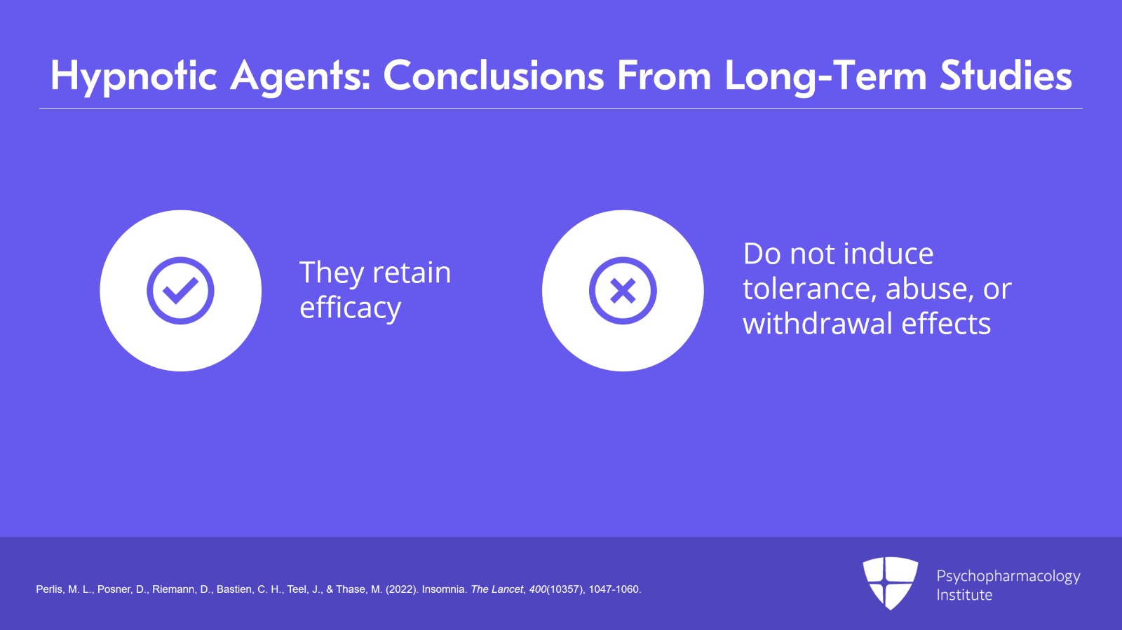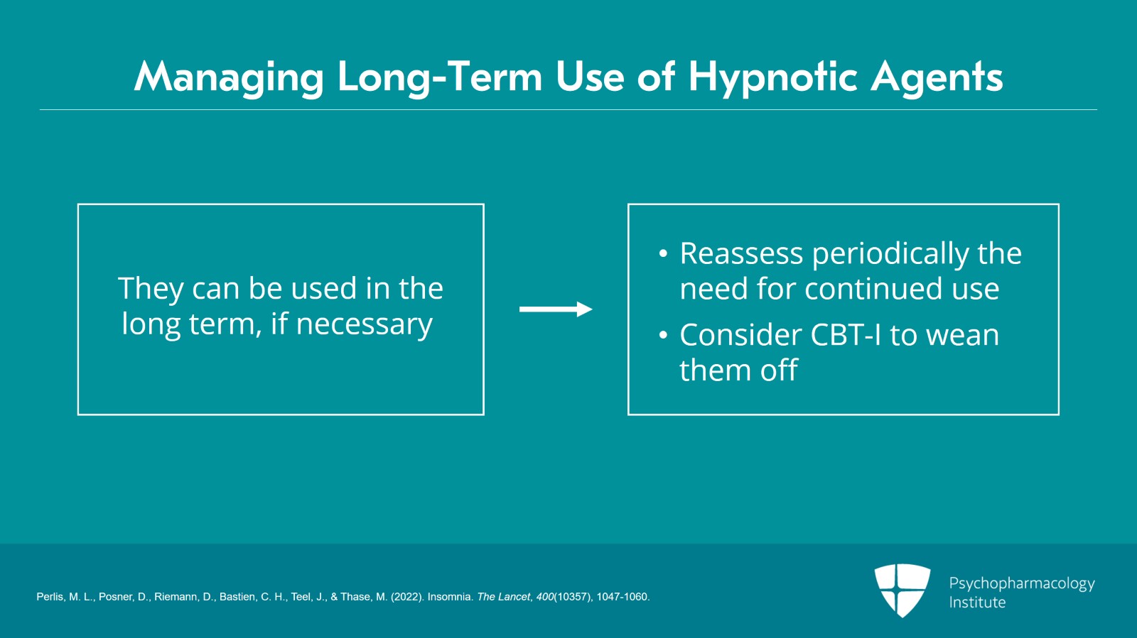 Thus, clinicians may use hypnotics long term if necessary. The need for continued use should be reassessed periodically. Periodic follow-up visits are recommended for patients with chronic use and patients should be advised to consider cognitive behavioral therapy for insomnia or CBT-I which can help them successfully wean off the hypnotic agents.