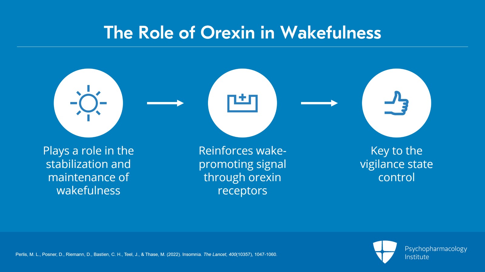 The neuropeptide orexin plays an important role in the stabilization and maintenance of wakefulness by reinforcing wake-promoting signaling in the brain via G protein-coupled orexin receptors, namely orexin-1 and orexin-2 receptors. Orexins are key to the vigilance state control as shown dramatically by the profound sleep-wake state instability in patients with narcolepsy who develop near complete loss of orexin neurons.