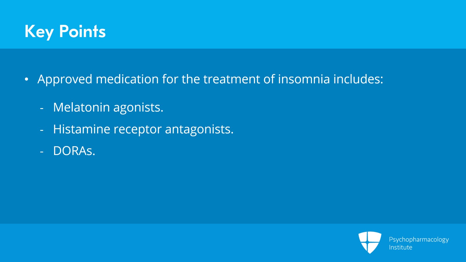 Key points. Medications including melatonin agonists, histamine receptor antagonists and dual orexin receptor antagonists have been approved for treatment of insomnia disorder.