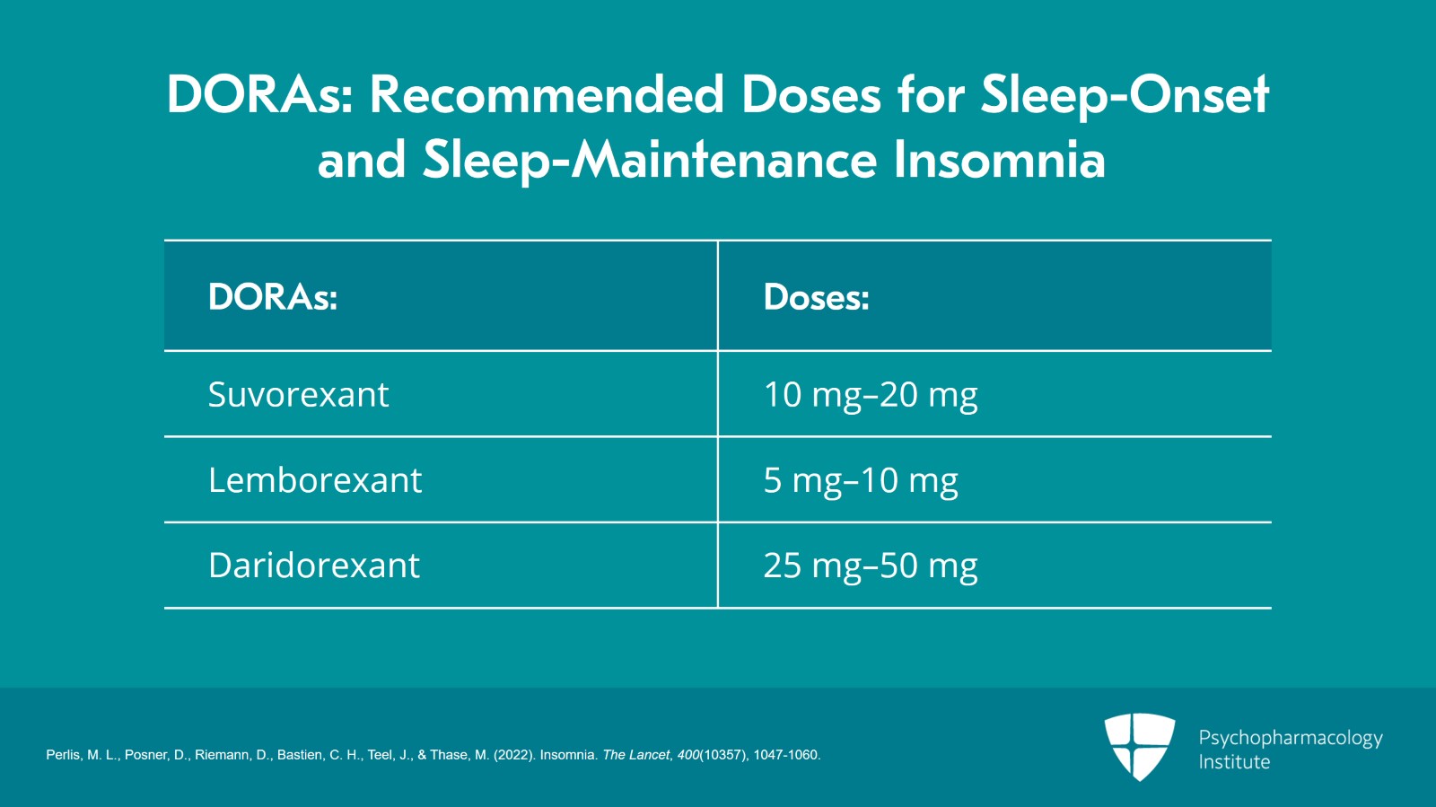 DORAs have been recommended for sleep-onset and sleep maintenance insomnia with more prominent effects on the latter. Currently, suvorexant at the dosages of 10 to 20 mg nightly, lemborexant at the dosages between 5 to 10 mg nightly and daridorexant 25 to 50 mg dosage range nightly have been recommended for treatment of insomnia disorder.