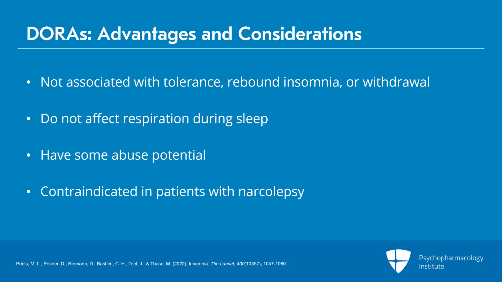On a good note, DORAs are not associated with tolerance, rebound insomnia and withdrawal upon abrupt discontinuation. DORAs have been shown to have absent respiratory effects during sleep which could be of value in patients with comorbid insomnia and obstructive sleep apnea. DORAs may have some abuse potential and therefore these medications are DEA Schedule IV medications. DORAs are contraindicated in patients with narcolepsy, a condition characterized by deficiency of orexin.