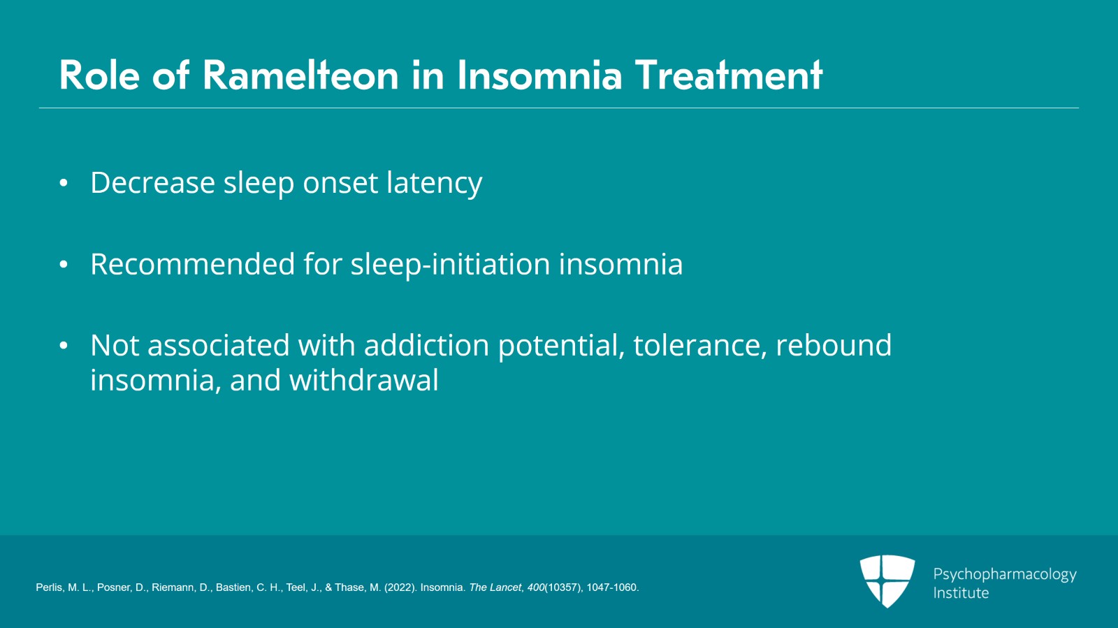 Ramelteon at the dose of 8 mg acts as melatonin-1 and melatonin-2 receptor agonists. Ramelteon has been shown to decrease sleep onset latency in patients with insomnia disorder and therefore it has been recommended for sleep initiation insomnia. Ramelteon has no addiction potential and it has not been associated with tolerance, rebound insomnia and withdrawal symptoms.