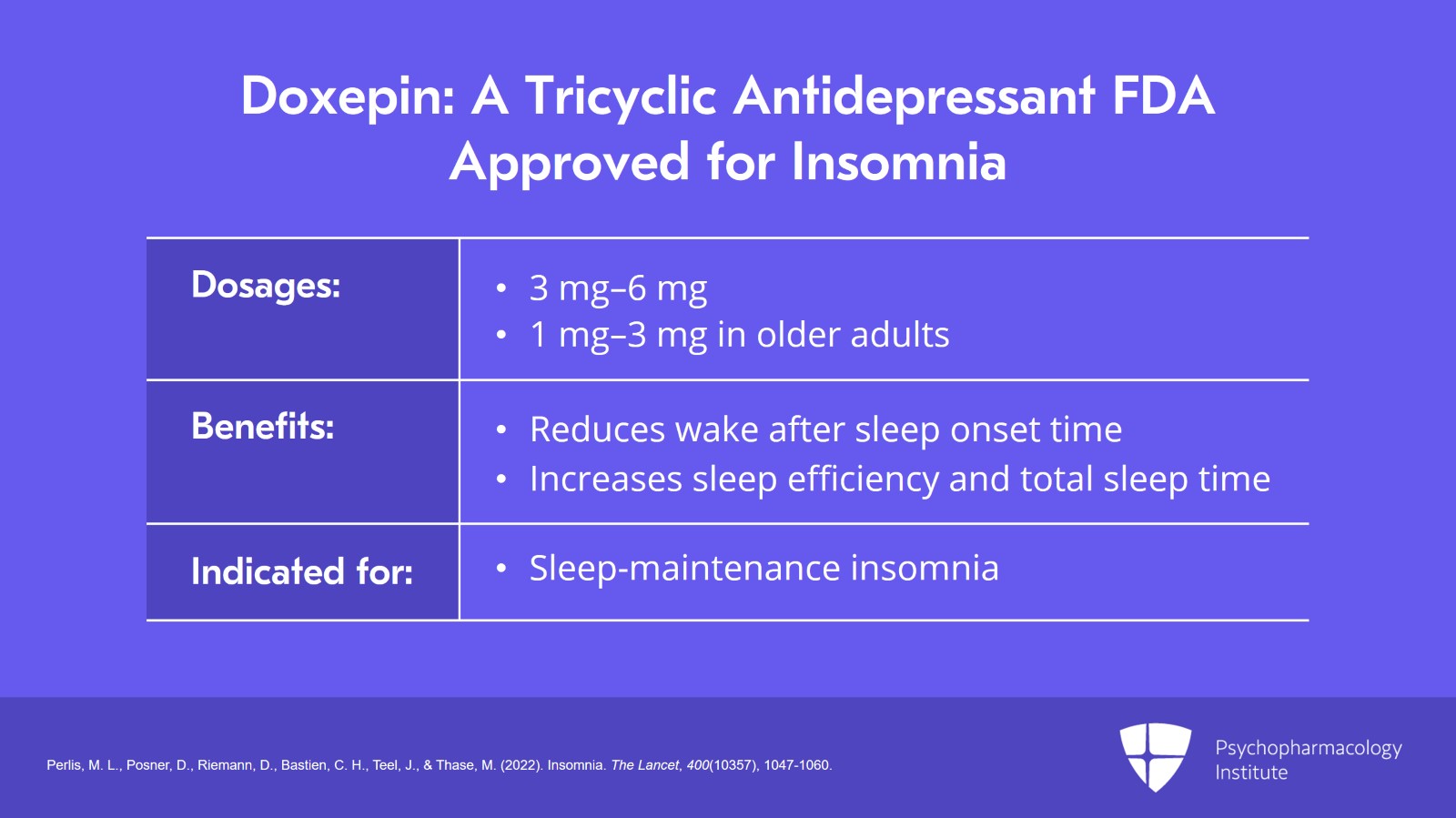 • Doxepin is indicated for sleep-maintenance insomnia.