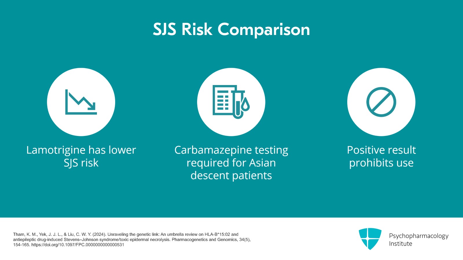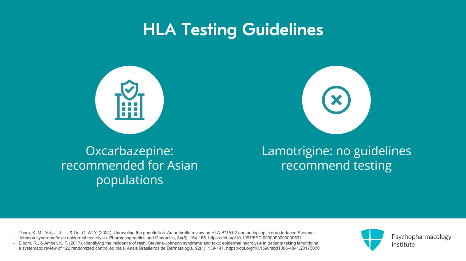 For oxcarbazepine, the testing is recommended by some medical groups but not by the FDA, again, and it's only recommended in Asian populations. For lamotrigine, no guidelines recommend the test because a positive result is not going to change your prescribing. Although it doubles the risk of Stevens-Johnson syndrome, that's still within the margin of error for the estimated risk which runs from 1 in 3000 to 1 in 6000.