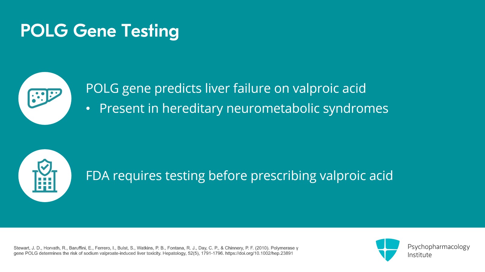 When it comes to recommended and required genes, there's another one to know about that predicts liver failure on valproic acid but this gene called polymerase gamma or POLG is only present in patients with hereditary neurometabolic syndromes like Alpers-Huttenlocher syndrome. The US Food and Drug Administration requires testing for POLG before prescribing valproic acid in those patients.