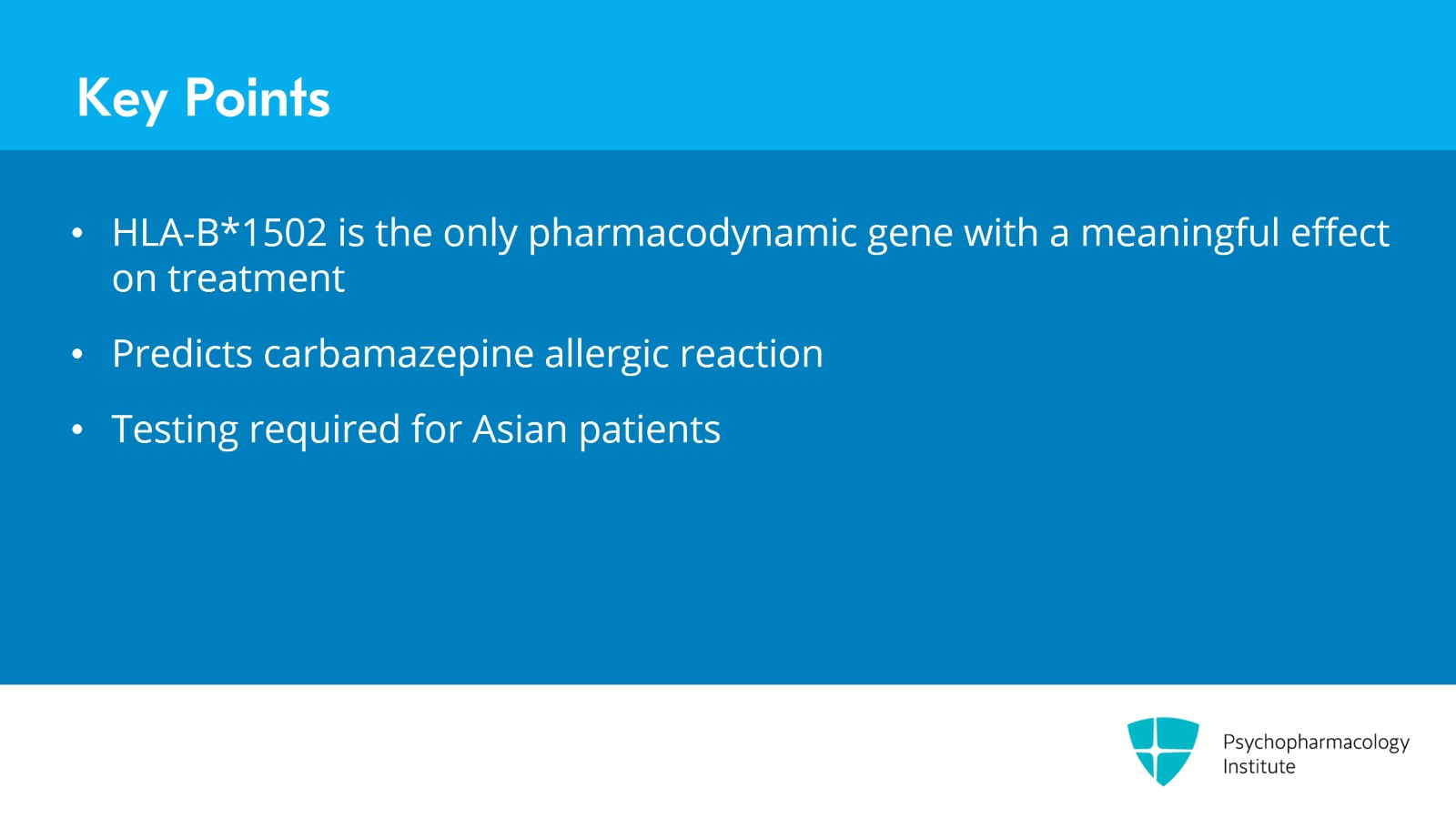 Let's recap the key points of this talk. Among the genes that have a clinically meaningful effect on treatment, only one is a pharmacodynamic gene, HLA-B*1502. This gene predicts a life-threatening allergic reaction to carbamazepine called Stevens-Johnson syndrome. Testing for this gene is required before prescribing carbamazepine in patients of Asian descent because that is the population where the gene is prevalent.