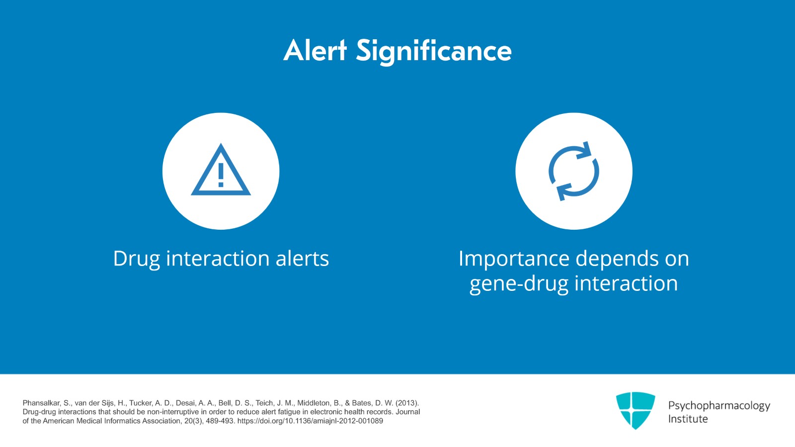 Earlier, I compared pharmacokinetic genes to drug interactions, and that comparison should've raised some eyebrows for you. I mean, how many times do you get alerts about drug interactions in your electronic medical record? And do you delve into all of them or suffer from alert fatigue? So why should we give these pharmacogenetic alerts any more weight? The answer depends on the medication. It's not just the gene that matters but the gene-drug interaction.