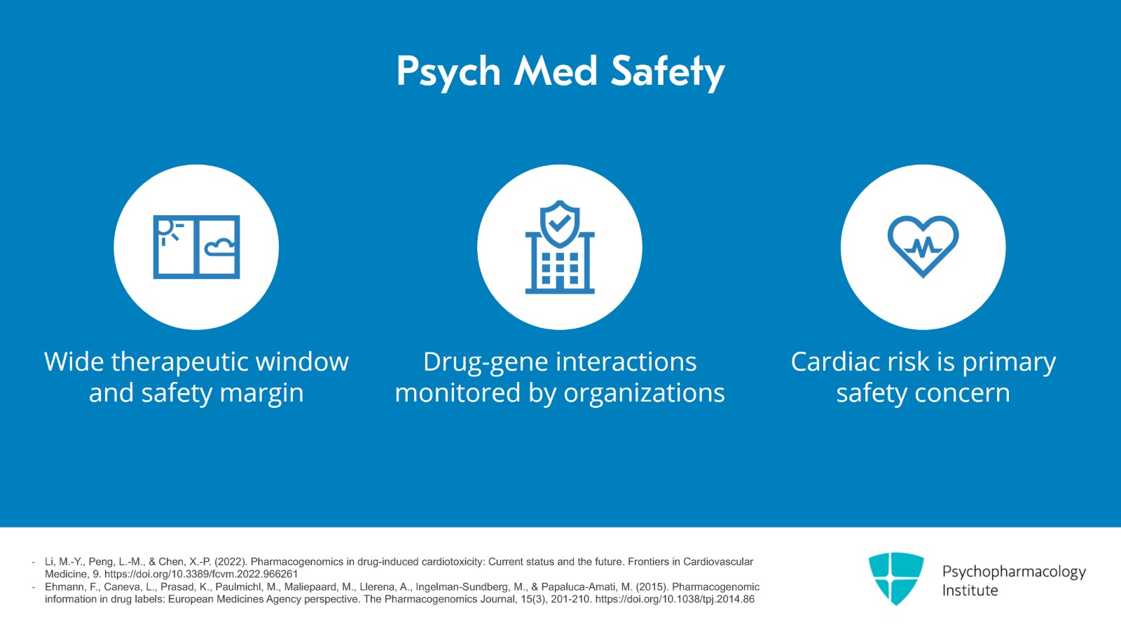 Most psych meds have a wide therapeutic window and a wide margin of safety, so we don't check blood levels or worry too much about drug interactions with them. Many are metabolized by multiple enzymes in the liver. So if one of them slows down, another can take over. Two groups, the Clinical Pharmacogenetics Implementation Consortium and the US Food and Drug Administration or FDA, keep an updated list of drug-gene interactions that matter. To make their list, there has to be clinical evidence that the drug-gene interaction could significantly compromise the medication's safety or efficacy. When it comes to safety, the risk these groups are most concerned about is cardiac.
