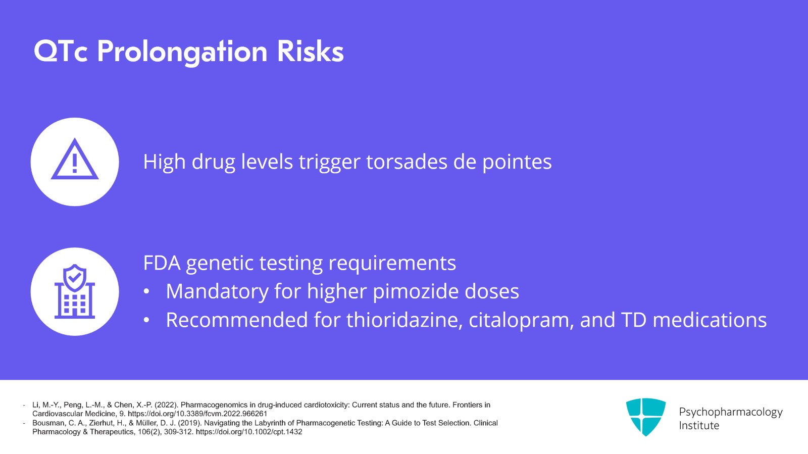 When drugs that prolong the QTc interval reach high levels, it can trigger a potentially fatal arrhythmia called torsades de pointes. In the United States, the FDA requires genetic testing before going to higher doses of pimozide and recommends testing for the medications thioridazine, citalopram and the tardive dyskinesia medications deutetrabenazine and valbenazine. All of these are for the QTc interaction.