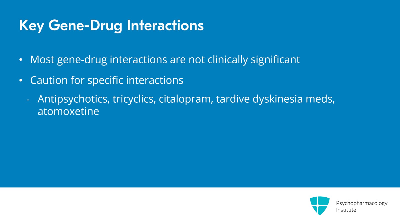 Let's pause to recap some of the key points. Just as with most drug-drug interactions, most gene-drug interactions do not make a meaningful difference in practice. Several groups have compiled the gene-drug interactions that you need to be cautious about. The list includes antipsychotics, tricyclic antidepressants, citalopram, tardive dyskinesia medications and atomoxetine.