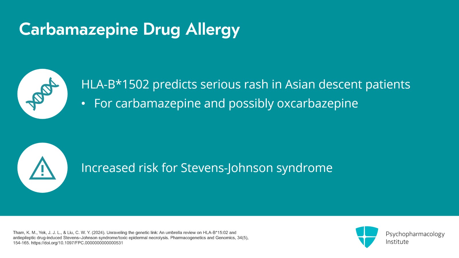 Now, let's look at the outlier on that list, a gene for a drug allergy with carbamazepine. One of these genes is not like the others. It's the HLA-B*1502 gene and it predicts whether patients of Asian descent will have a serious rash on carbamazepine and possibly on oxcarbazepine. Patients who are positive for the HLA-B*1502 are 80 times more likely to develop Stevens-Johnson syndrome on carbamazepine and they're 30 times more likely to develop it on oxcarbazepine.
