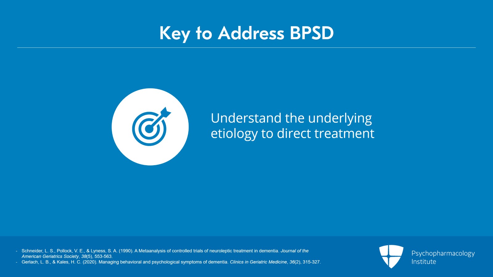 And when trying to understand how to best address a behavioral and psychological symptom in dementia, it’s really important to understand what the underlying etiology is and that will really help you direct treatment. So a urinary tract infection, pain, issues with the caregiver, or psychosis should all be addressed very differently.