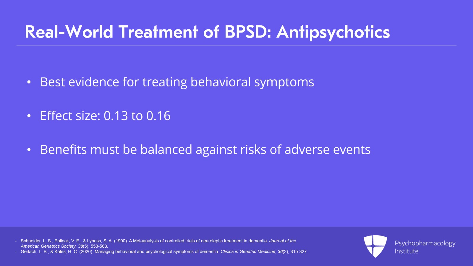 However, in real-world treatment, patients with behavioral and psychological symptoms of dementia often receive antipsychotics. Now, while antipsychotics do have the best evidence for treating these symptoms, their effects, meaning the magnitude of their treatment size, are moderate at best and they have an effect size of 0.13 to 0.16. And any benefits with an antipsychotic must be balanced against the risk of adverse events including mortality as outlined by the US FDA box warning.