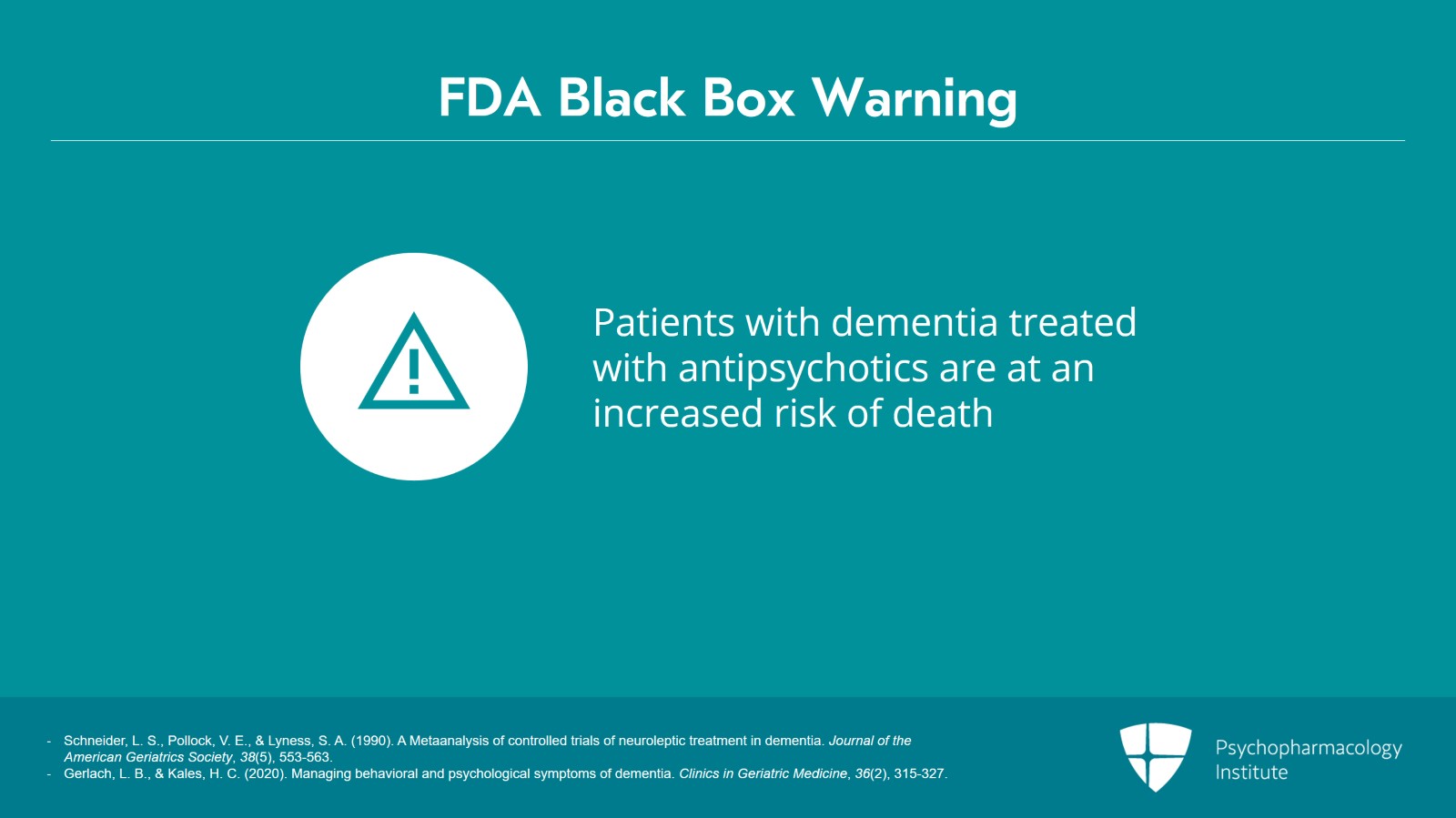 • Schneider, L. S., Pollock, V. E., & Lyness, S. A. (1990). A Metaanalysis of controlled trials of neuroleptic treatment in dementia. Journal of the American Geriatrics Society, 38(5), 553-563.