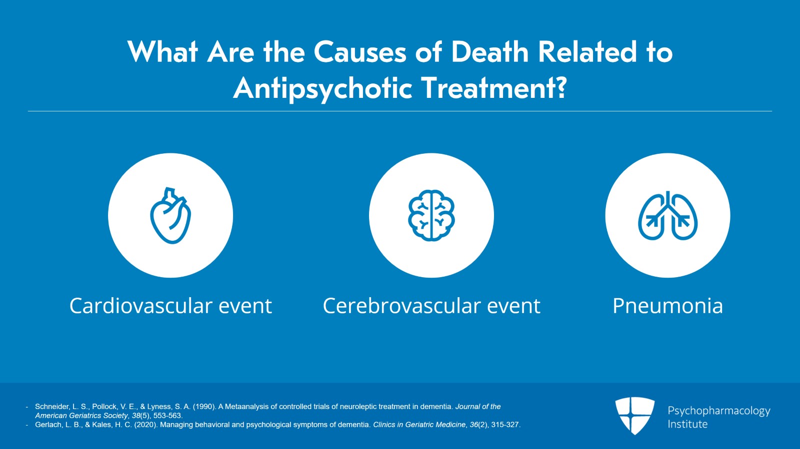 And folks often ask, what are the causes of death related to antipsychotic treatment? And generally, that tends to be a cardiovascular event like a ventricular arrythmia or prolonged QTc. It can be a cerebrovascular event like a stroke or a pneumonia like an aspiration event.