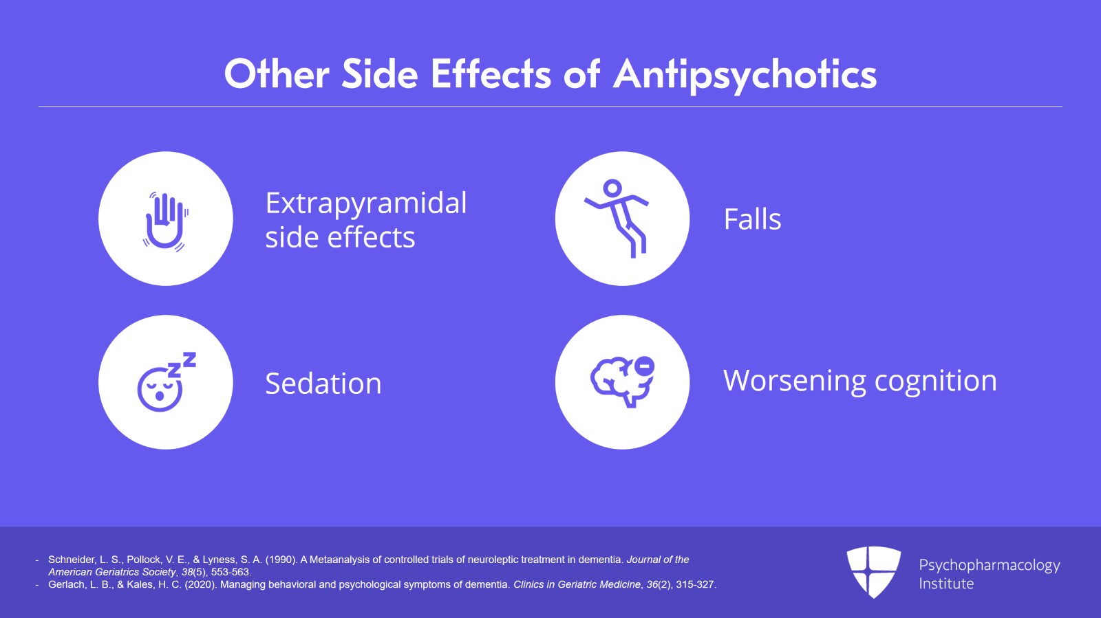 It’s important to remember though that antipsychotics have many other side effects other than just the increased mortality risk which can also cause distress for patients. And those can include things like extrapyramidal side effects, falls, sedation as well as worsening cognition.