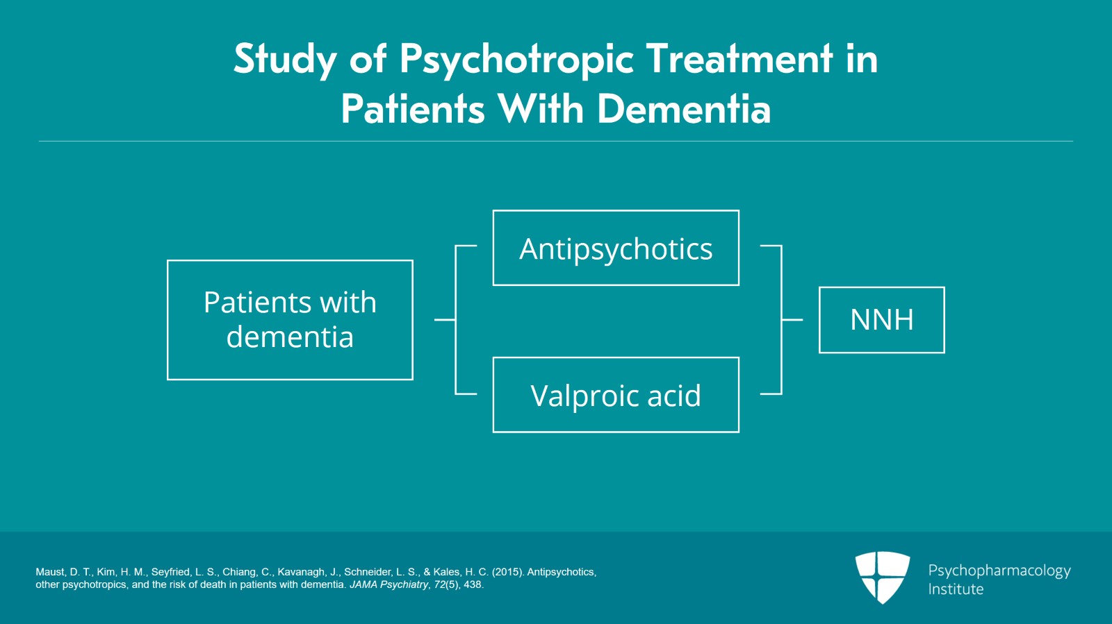 So I’ll highlight some findings from a few studies here. The first study was done by Donovan Maust which took a look at patients with dementia who received antipsychotic medications as well as valproic acid and looked at the number needed to harm for each of these medications. So they looked at how many patients had to be treated to cause one episode of death or what they called harm.