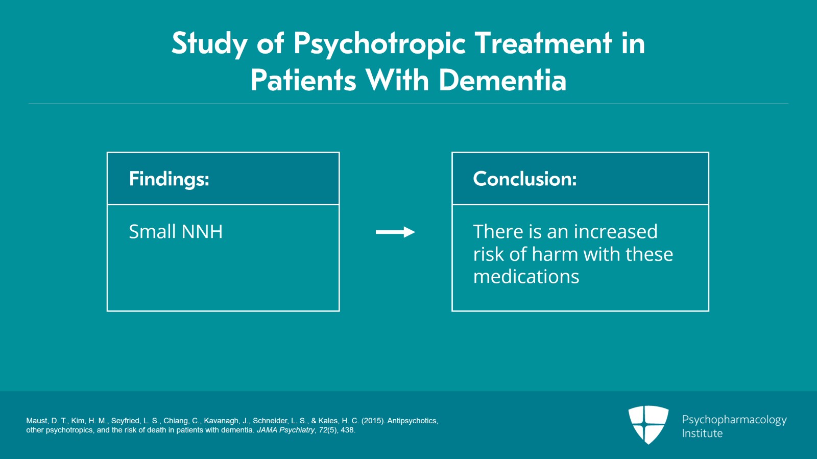 • Maust, D. T., Kim, H. M., Seyfried, L. S., Chiang, C., Kavanagh, J., Schneider, L. S., & Kales, H. C. (2015). Antipsychotics, other psychotropics, and the risk of death in patients with dementia. JAMA Psychiatry, 72(5), 438.