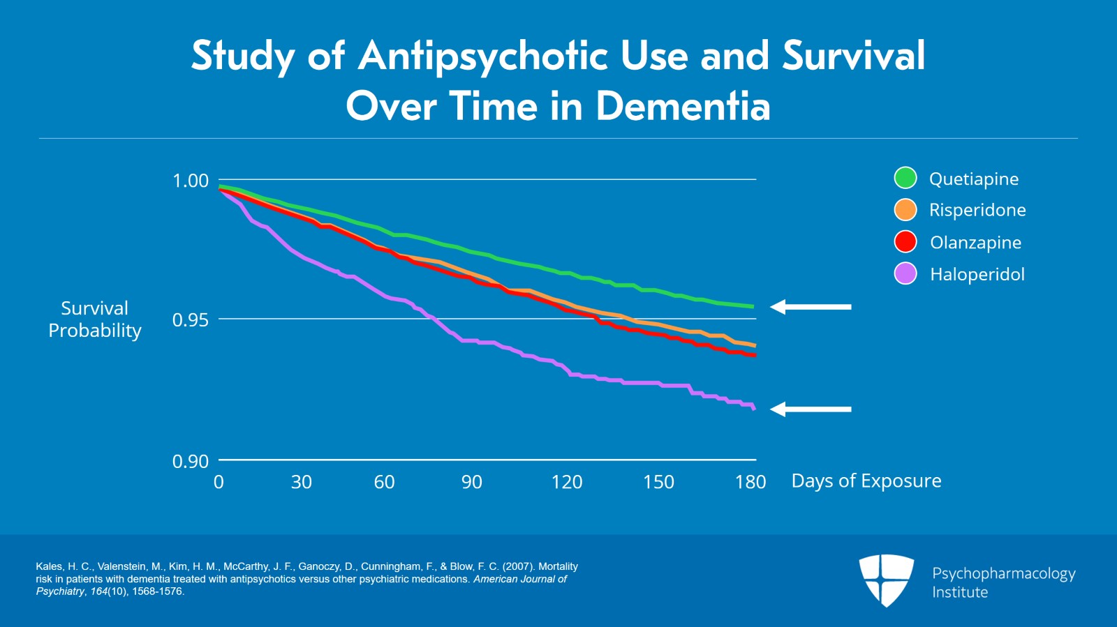 The figure here shows a graph from a study from Helen Kales looking at veterans with dementia who were prescribed different antipsychotic medications and survival over time. And as we can see, patients with dementia who are prescribed these medications have decreased survival curves, meaning that each of these medications is associated with mortality. Haloperidol is the purple line here which has a steeper slope and associated with greater mortality. Quetiapine is the green line on top, a little bit less but still an increased mortality risk.