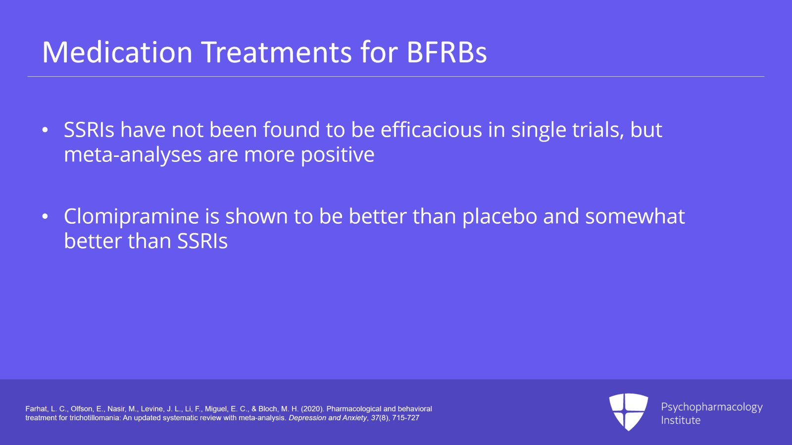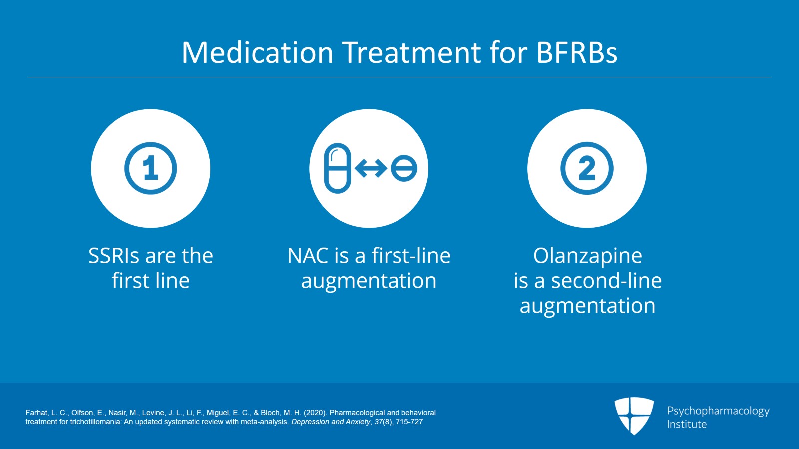So medication treatment. So important to note that a treatment for one BFRB can be generalized to the other BFRBs. So if one study is done in hair pulling disorder, you can pretty much take that study and apply it to someone with skin picking disorder or any other specified OCRD that’s a BFRB as well.