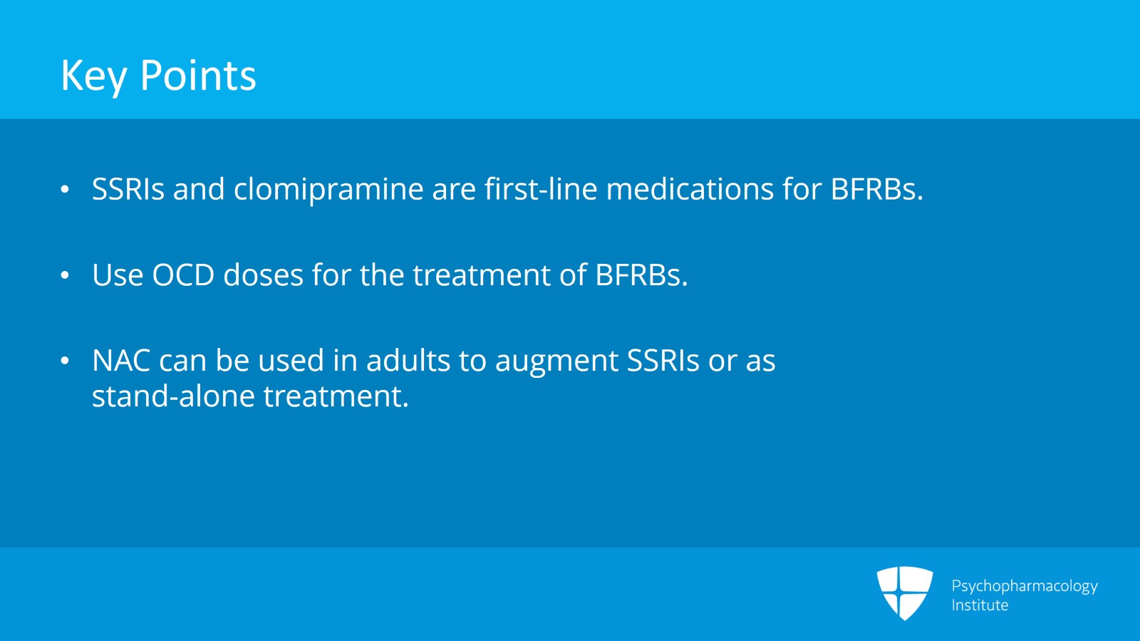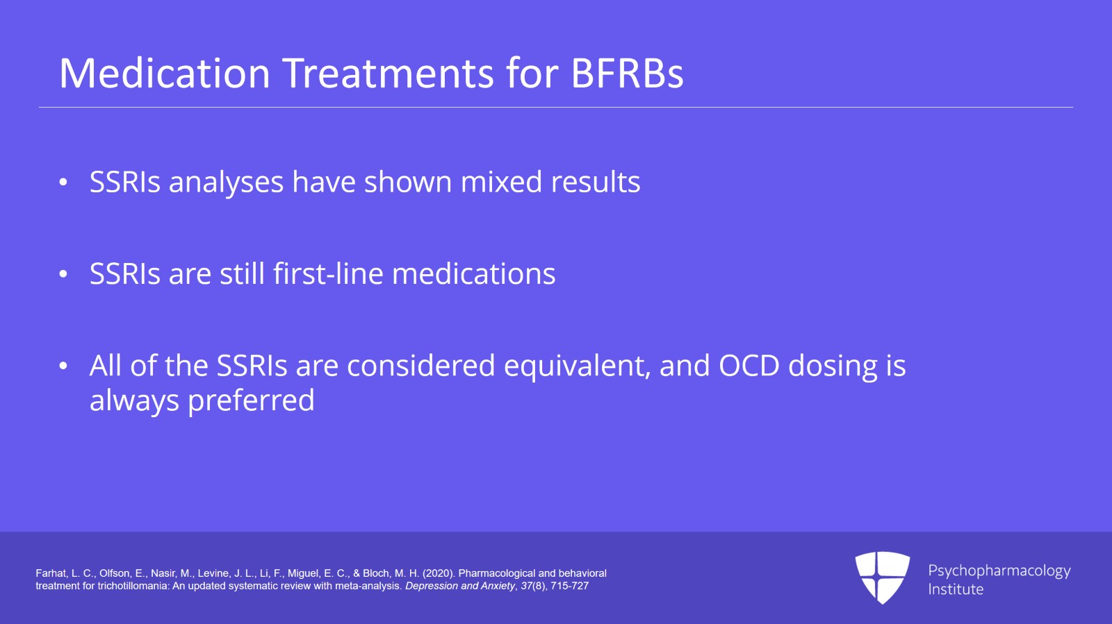 Note that there have been some analyses that have shown that SSRIs do not work. There have been some analyses that show that they do work. At this time, my recommendation is that still we use SSRIs in these patients and that the SSRIs are first-line medications in accordance with usual OCD treatment protocol. Again, all the SSRIs are considered equivalent with BFRBs. And OCD dosing is always preferred in these cases.