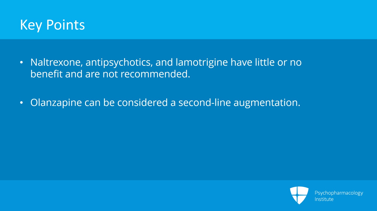 Commonly, I see naltrexone, antipsychotics and lamotrigine used in this population. They’ve been shown to have little or no benefit and therefore, not recommended despite their popularity among clinicians. Now, the one exception to that is olanzapine at 10 mg. It was shown to be effective in one study. Therefore, it can be considered second-line augmentation behind NAC.