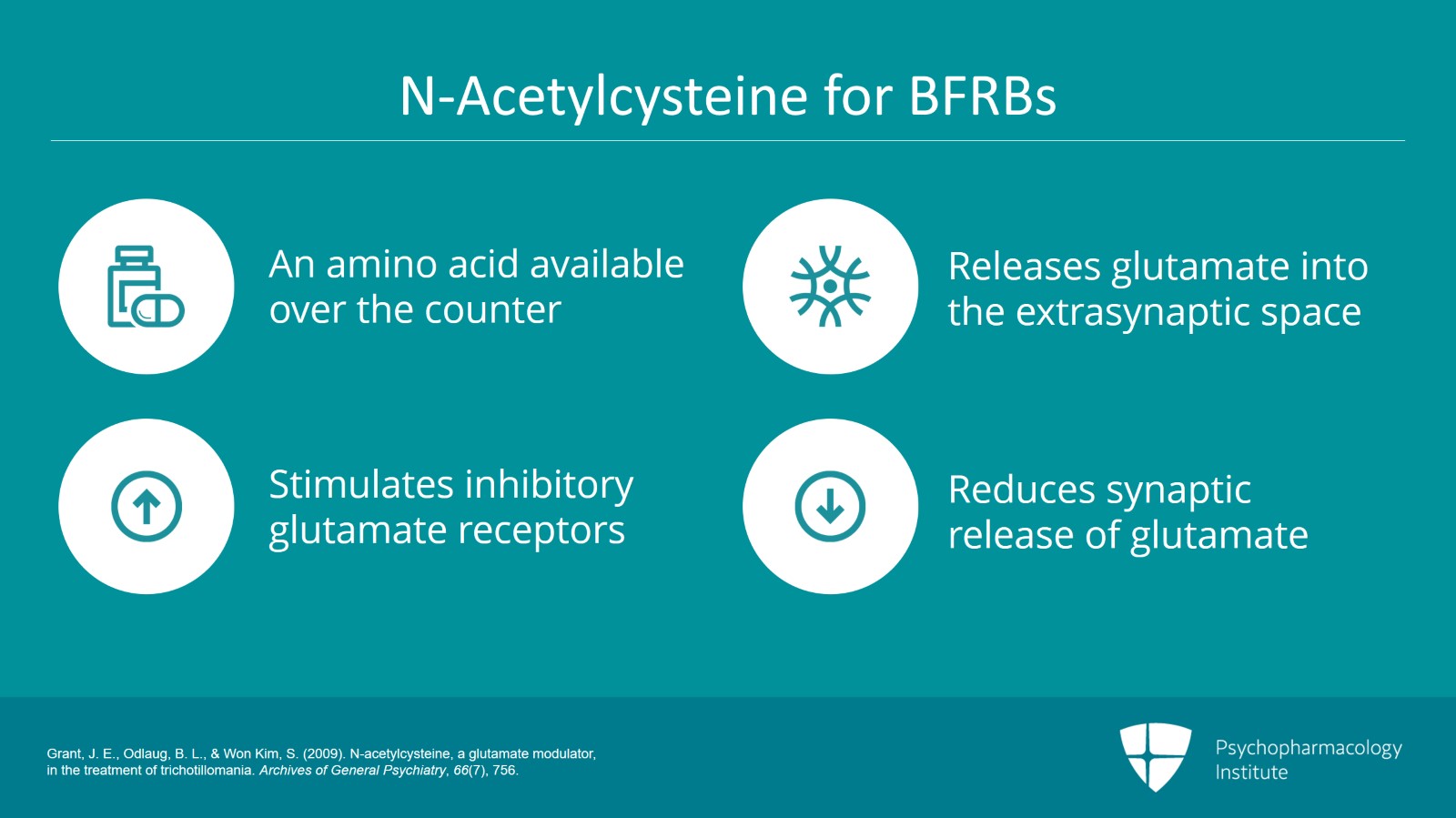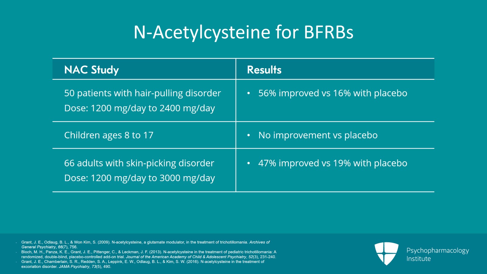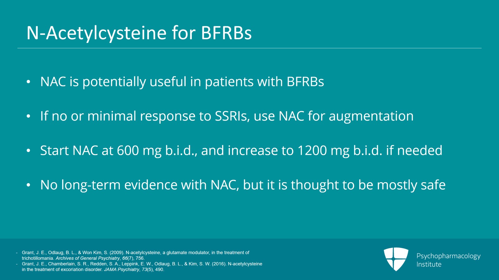 So therefore, I think that NAC is certainly a medication that is potentially useful in patients with BFRBs and may be something that has been a bit of a game changer with this in the sense that it’s certainly gotten a lot of popularity. I still do recommend that since there are no formal consensus guidelines on what’s first-line treatment, NAC or SSRIs, I do recommend that patients still follow typical OCD protocol, that patients should be placed on SSRIs first. However, the difference with that being if the patient does not respond or only minimally responds to the SSRI, the first logical augmentation choice should be NAC at that point. NAC is usually started at 600 mg b.i.d. You can increase to 1200 b.i.d. if needed.