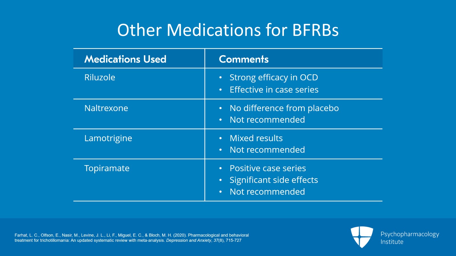 Other medications. Riluzole is a medication that has been approved for ALS but is shown to have strong efficacy in OCD. It has been effective in case series. Now, naltrexone has been used in the past due to perceived similarities with substance abuse disorders. People are thinking, well naltrexone works for substance abuse disorders, BFRBs kind of act like a substance use disorder. Naltrexone did not separate from placebo. It’s not recommended in these patients. Lamotrigine, at best mixed results, not recommended. Topiramate has been studied. There has been a positive case series. However, significant side effects with this medication again makes this something that is not recommended at this time.
