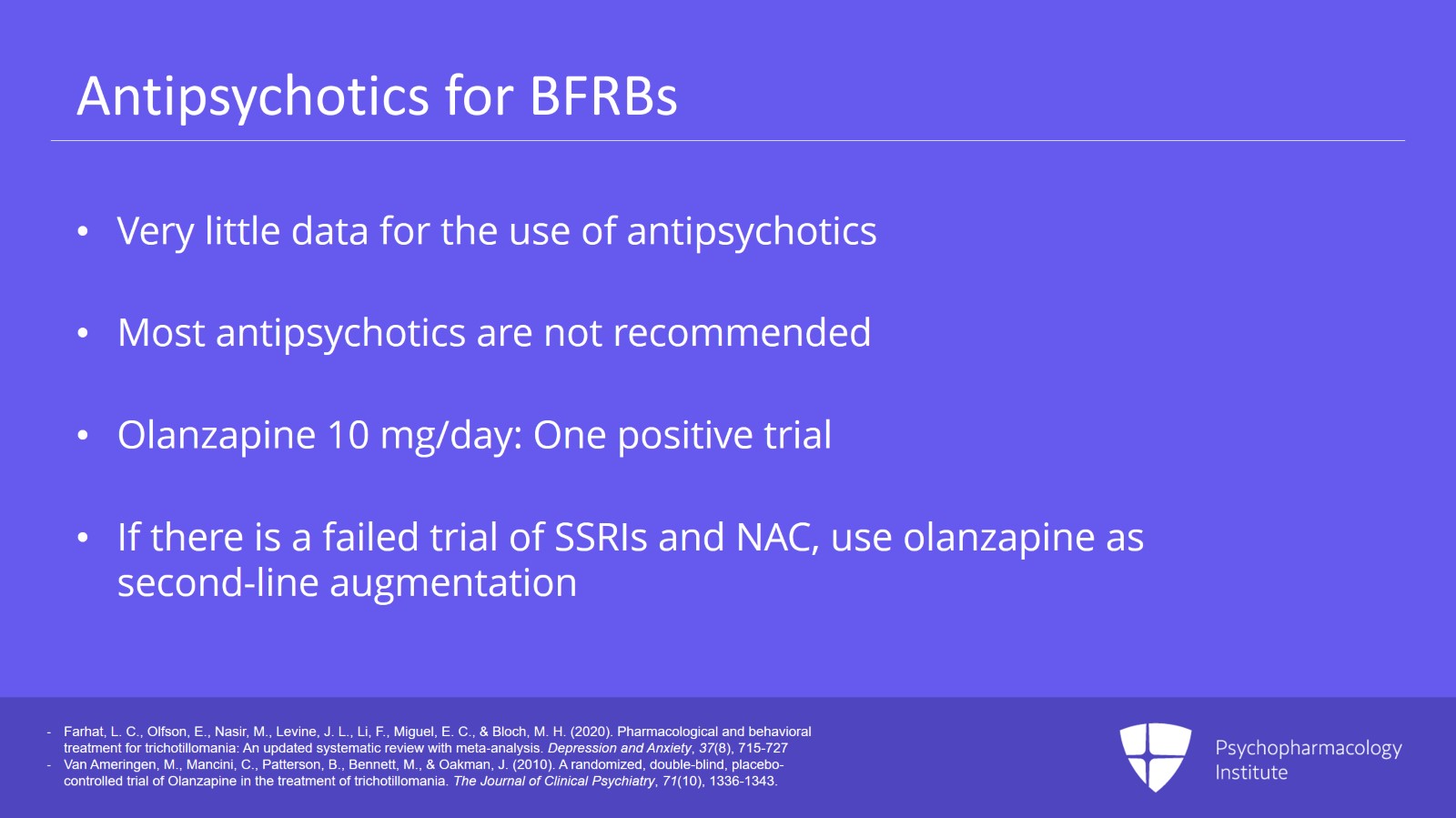 Now, there is very little data for the use of antipsychotics and most of it is mixed or open label trials or case series. And therefore, most of the antipsychotics which are often commonly and typically used in BFRBs are not recommended. There is one exception to that. There was one positive double-blind, placebo-controlled trial with olanzapine used at 10 mg daily. As a result, with these BFRBs, if someone has failed SSRIs and if they have failed NAC, I will recommend that they use olanzapine as a second-line augmentation then at that time.