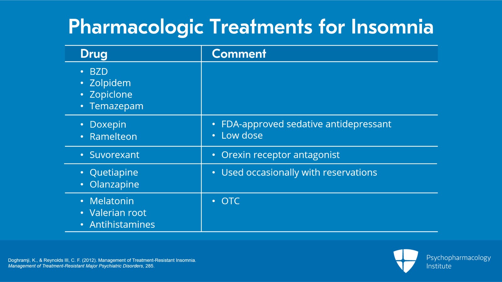 - Doghramji, K., & Reynolds III, C. F. (2012). Management of Treatment-Resistant Insomnia. Management of Treatment-Resistant Major Psychiatric Disorders, 285.