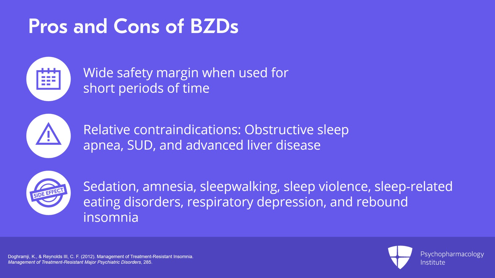 Let’s talk a little bit about each of these classes and their positives and negatives if you will. With respect to the use of benzodiazepines for a short period of time, in general, their margin of safety is wide. They are relatively contraindicated in patients who have obstructive sleep apnea or substance use disorders or advanced liver disease. Be mindful of the adverse side effects of benzodiazepine usage including excessive sedation during the day, anterograde amnesia, some instances of sleepwalking and sleep violence, sleep-related eating disorders and respiratory depression as well as rebound insomnia after their use is discontinued.