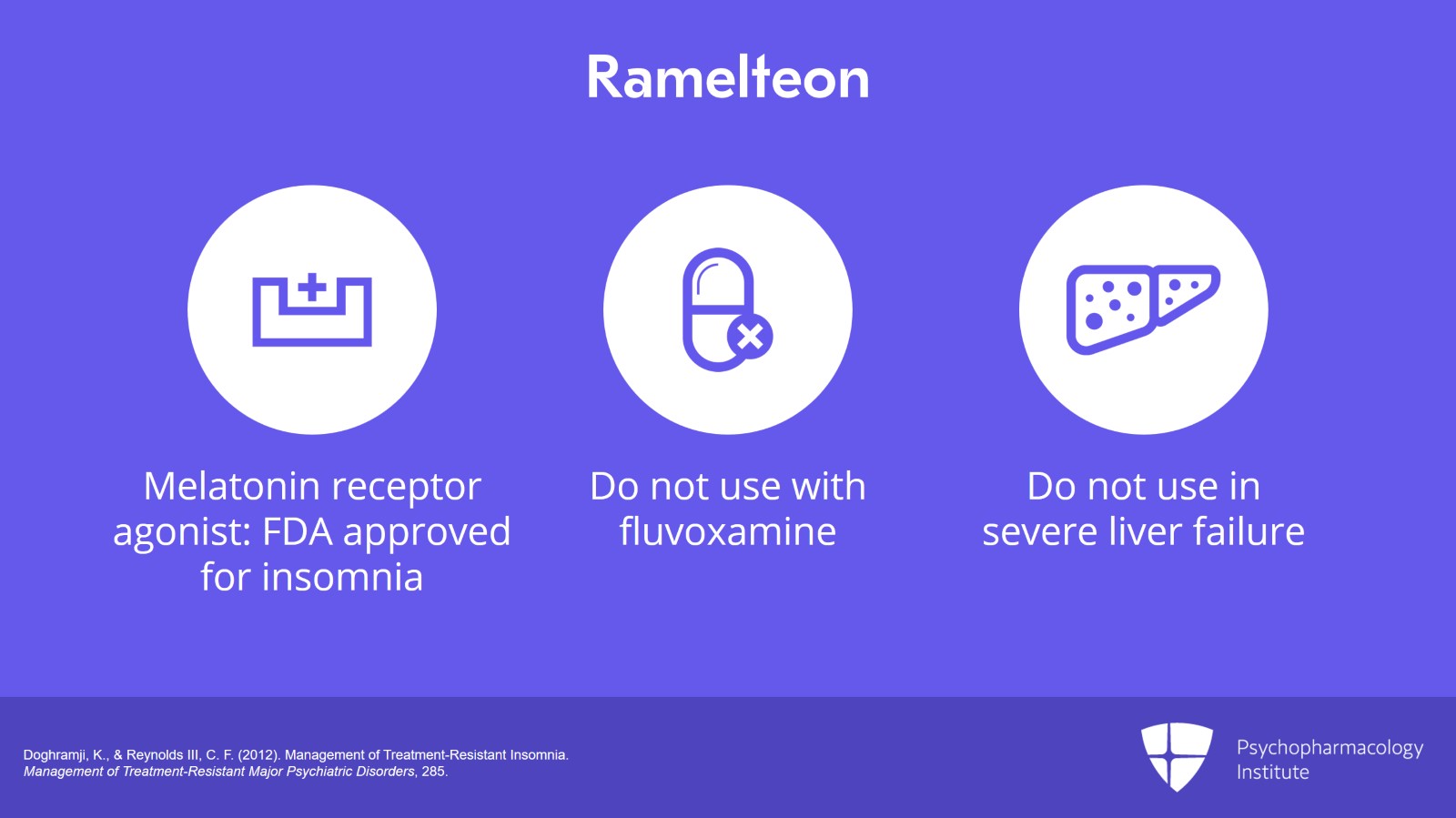 Ramelteon is the first melatonin receptor agonist approved for the treatment of insomnia. Generally valuable in my experience in patients having difficulty falling asleep. It should not be used concurrently with fluvoxamine or severe liver failure.