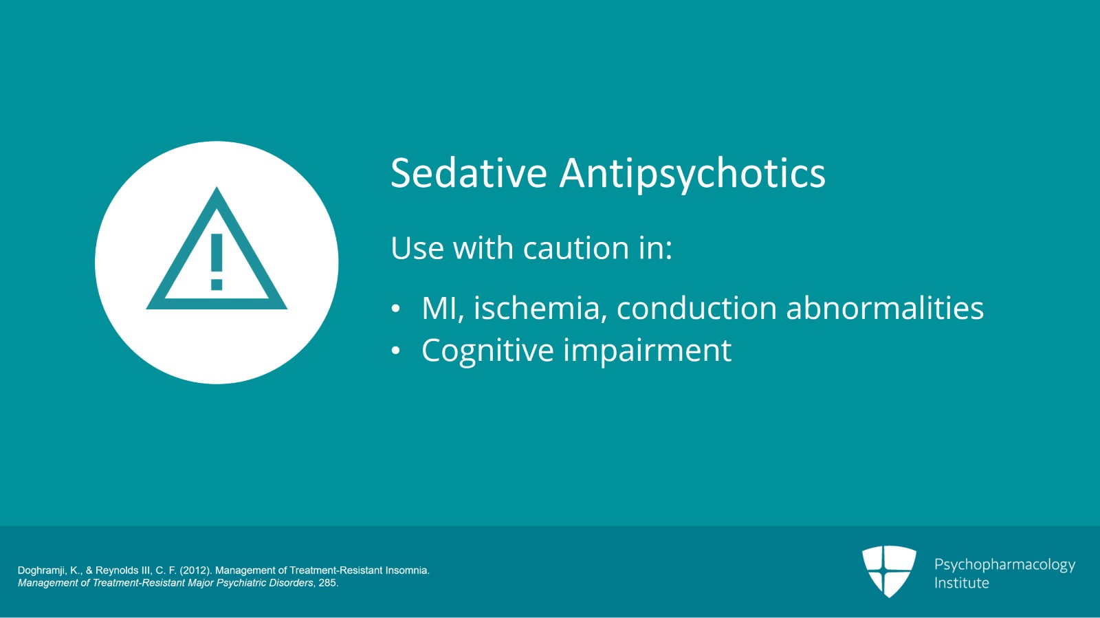 I don’t recommend the use of sedative antipsychotics like quetiapine or olanzapine in patients with sleep issues and they need to be used obviously cautiously in patients with MI, ischemia, conduction abnormalities or cognitive impairment particularly those with dementia.